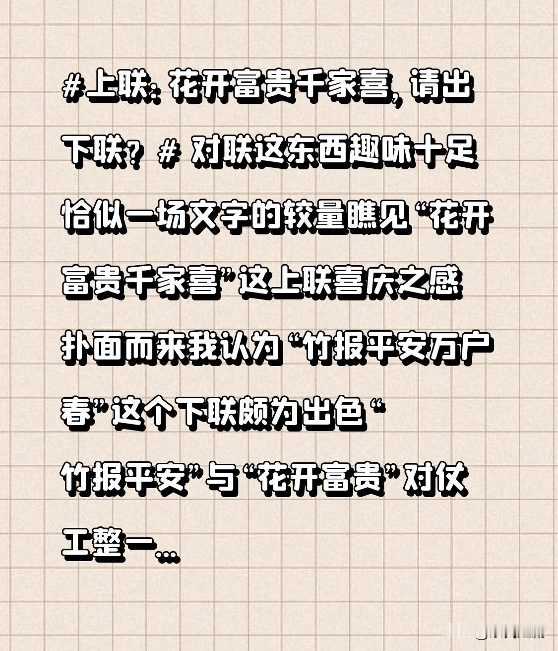 对联这东西 趣味十足 恰似一场文字的较量 瞧见“花开富贵千家喜”这上联 喜庆之感 扑面而来 我认为 “竹报平安万户春”这个下联 颇为出色 “竹报平安”与“花开富贵” 对仗工整 一个是竹子寓意平安 一个是花朵象征富贵 画面感十足 “万户春”对应“千家喜” “万”对“千” “春”对“喜” 皆传递着美好祝愿 仿若能看见 千家万户都洋溢着幸福与欢乐 韵味十足