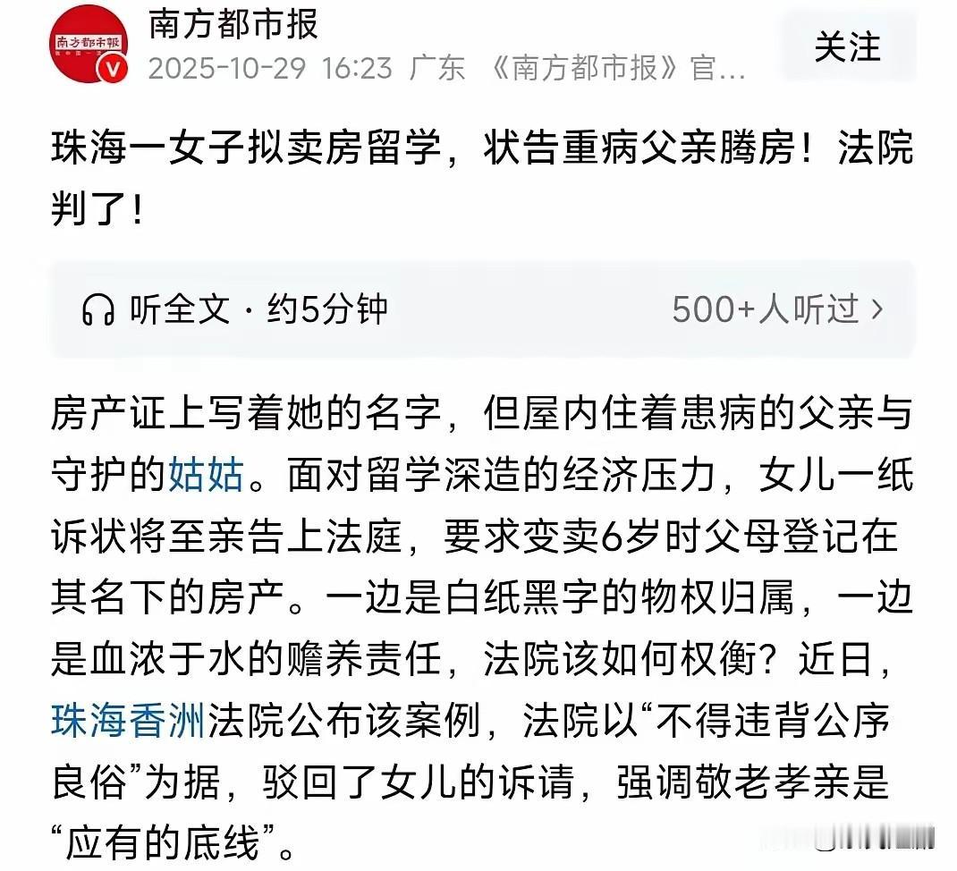 在法律公正与人情温暖间 正义光辉照亮被忽视的角落 2008年 老王和妻子满怀希望 购置80多平方米房产 为家庭未来筑牢基础 两年后 房子顺利交付 夫妻俩深思熟虑 将房产登记在6岁女儿小美名下 这决定 是为孩子未来 是家庭爱与信任的体现 然而 岁月流转带来变故 父亲年事渐高 健康恶化亟需资金治疗 面对高昂费用 女儿小美决定行动 她认为父亲生命比房产重要 便以父亲名义起诉 要求卖房用于治疗 法院判决令人称赞 审理后认为 房产虽登记在小美名下 但属父母赠与子女财产 有特殊家庭关系背景 父亲病重急需资金时 房产处置应优先维护其生命健康 判决父亲出售房产 用所得款治疗确保安全 此判决体现法律人文关怀 彰显“合法合理、善意维护”司法精神 既保护财产权利 也尊重亲情与责任 让人感受法律不是冰冷规则 而是温暖人心的守护者 面对家庭危难 法律正义成坚实后盾 助困境中的人走出难关 这起案件引发社会深思 家庭财产关系 要符合法律规定 也要有人情关怀 法院判决维护法律尊严 彰显人性光辉 树立“正规”又温情的司法典范 未来社会生活中 希望更多家庭以法律为依归 以爱为纽带 共对困难挑战 让法律正义与人性善良交相辉映 营造和谐温暖的社会环境