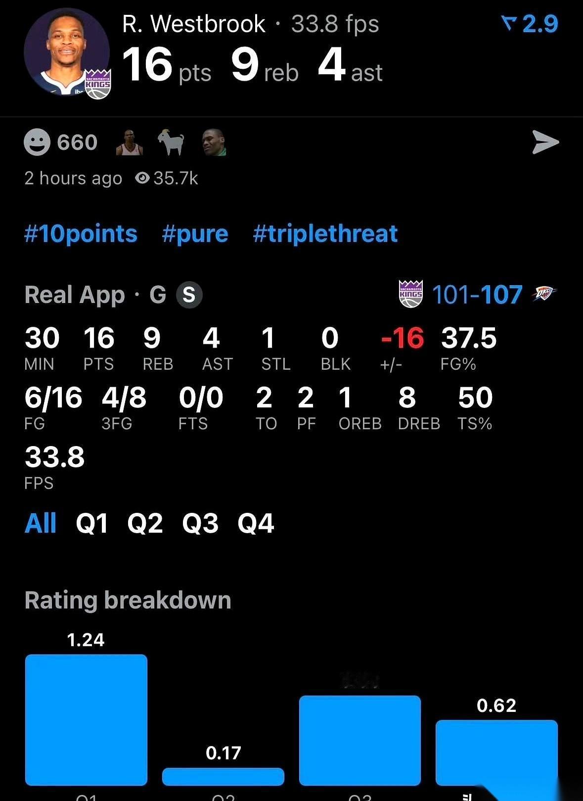 开场那6分钟,我以为那个男人回来了。 真的,就对着老东家,连着三记三分,弹无虚发,看得我差点从沙发上跳起来。那股劲儿,那股“老子今天就是要干翻你们”的狠劲儿,熟悉得让人想哭。 结果呢? 结果全场打完,16次出手,只进了6个。 正负值-16,全队最扎眼那个。 这就是威少现在最让人难受的地方。 你说他不行了吧,他总能冷不丁给你来这么一段高光,让你觉得他油箱里还有的是油,他还能战。 但你说他还行吧,他又总在最要命的时候,用一种最“威少”的方式,把刚燃起来的希望,亲手给你浇灭。 领先了一整场啊,最后被翻盘。 这种感觉,比从头到尾被压着打还难受一百倍。 看他打球,真的,太考验心脏了。 一场球的时间,让你把天堂和地狱都逛了一遍。