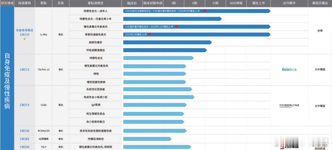 提到自免药物,绝对绕不开“NewCo之王”康诺亚。成立于2016年的康诺亚虽然年轻,但已经在国内自免领域率先跑出来。2024年9月,康诺亚的核心产品司普奇拜单抗成功获批上市,用于治疗成人中重度特应性皮炎。这是国内首个、全球第二个获批上市的IL-4Rα单抗,对标的正是赛诺菲的“药王”级产品度普利尤单抗。图:康诺亚自免管线一览,来源:公司公告