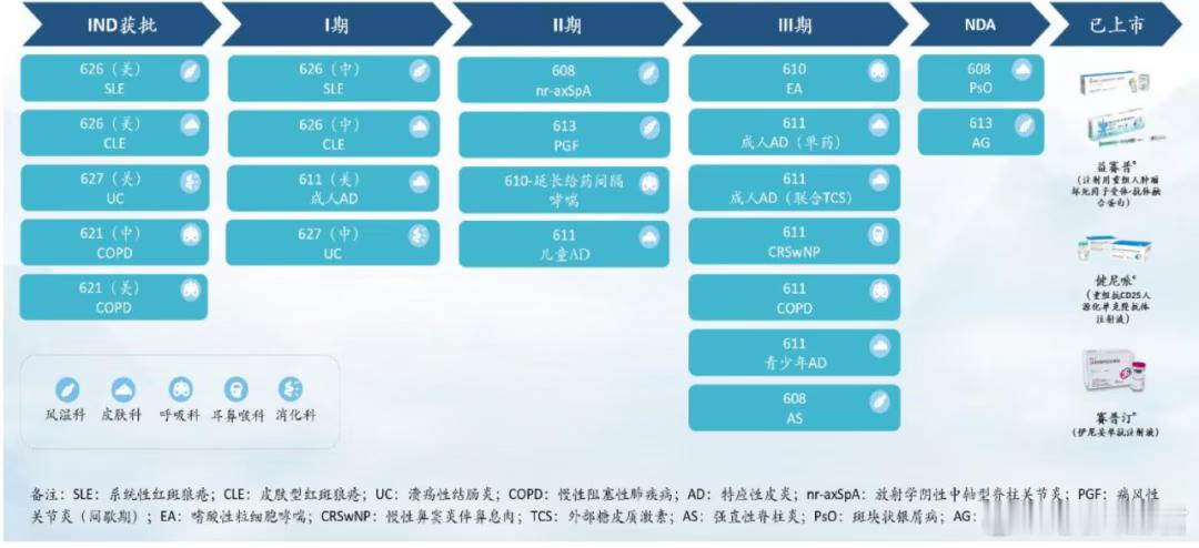 荣昌生物本是以ADC药物闻名的创新药企,如今却靠着泰它西普在自免领域做的风生水起。早在2021年3月,荣昌生物的泰它西普就在中国获附条件批准上市,用于治疗治疗系统性红斑狼疮,当年销售额达到4730万元。2022年,泰它西普降价68.34%进入医保,成功以价换量。此后,荣昌生物也在持续努力拓展后续适应症。2024年7月,泰它西普拿下了类风湿关节炎这一适应症。今年上半年又获批了重症肌无力这一大适应症。图:荣昌生物自免管线一览,来源:公司公告