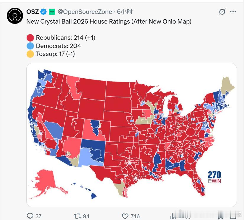【黄金时代】在俄亥俄选取图成功划分后,2026年中期选举最新水晶球预测,国会: