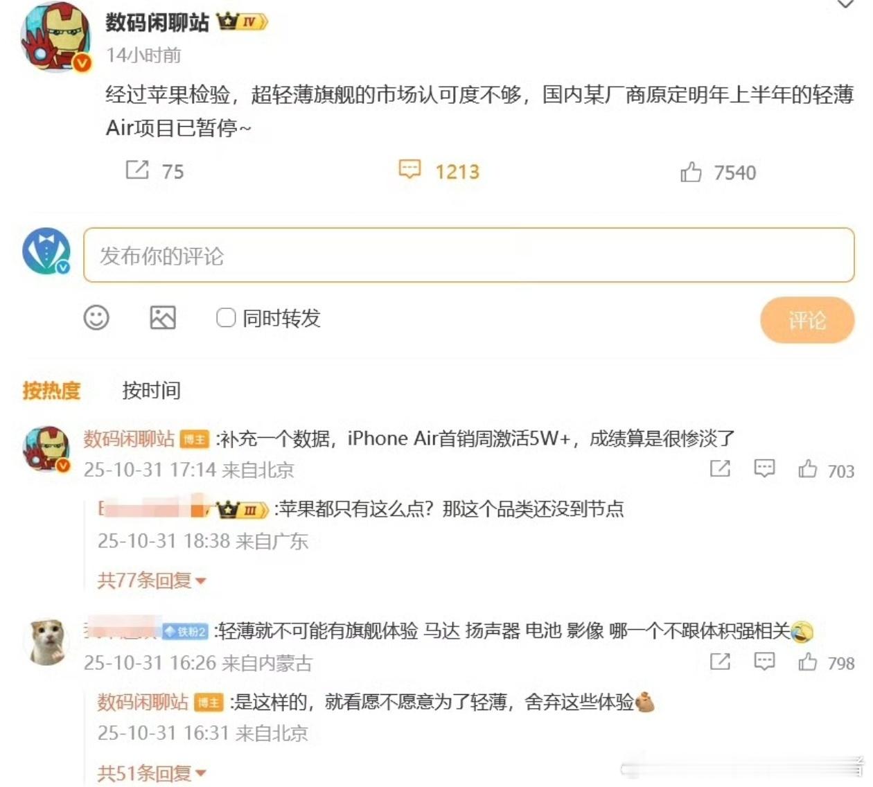 iPhoneAir激活量曝光做轻薄手机可以,但起码把部分基础体验做好,价格不能太离谱,iPhone Air的失败是必然的,为了极致轻薄,舍弃了太多配置,同时它的价格也是高高在上。没有多少用户会愿意花费八九千买一台这样的产品。主要还是价格太贵了。
