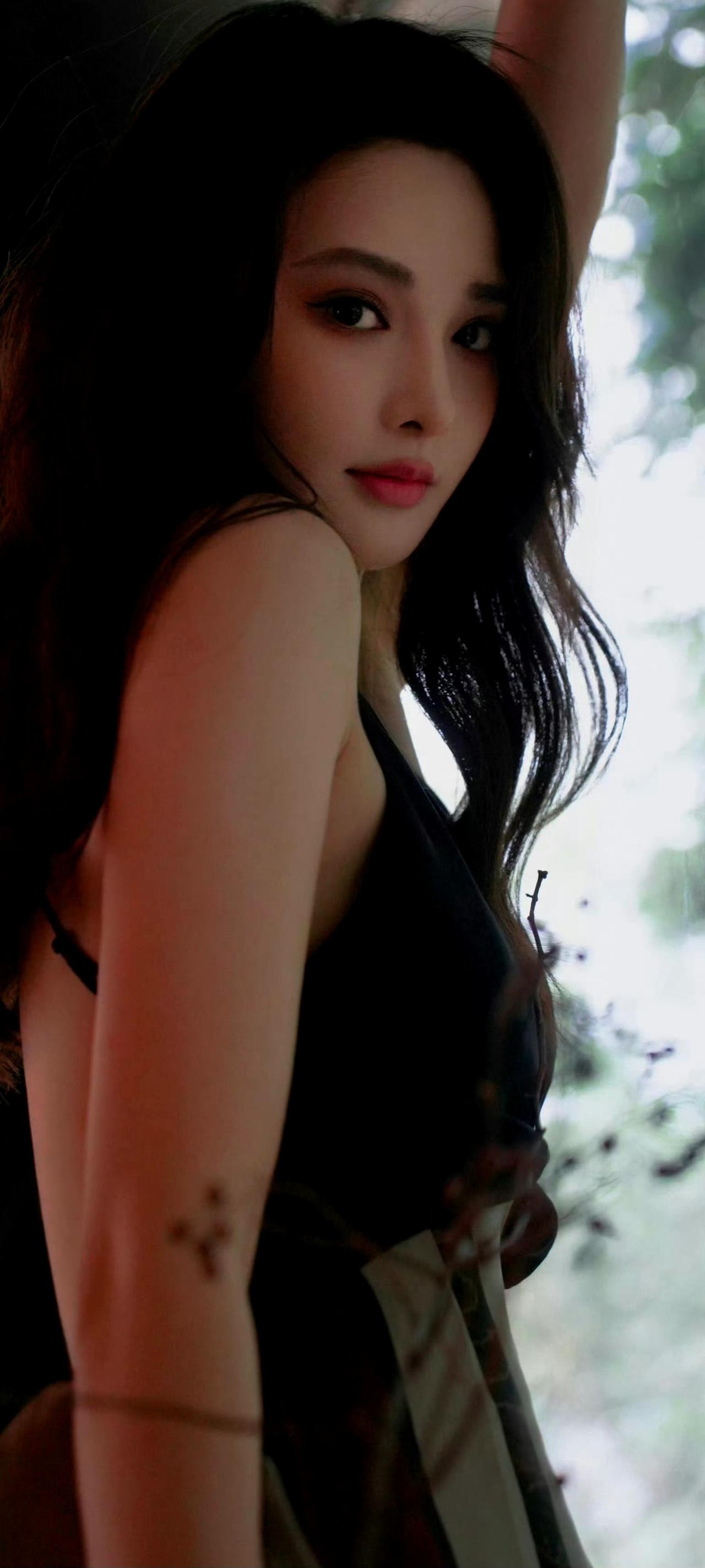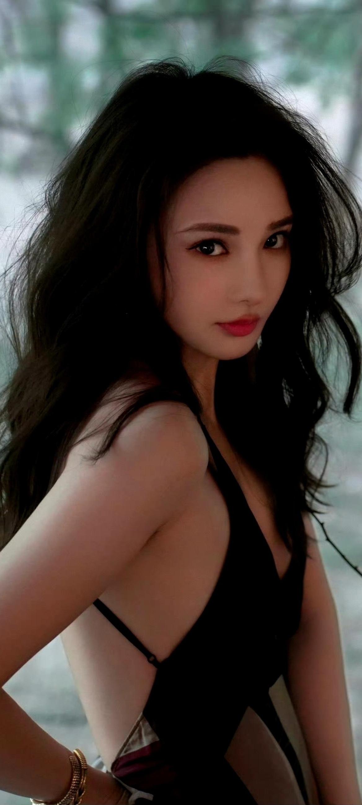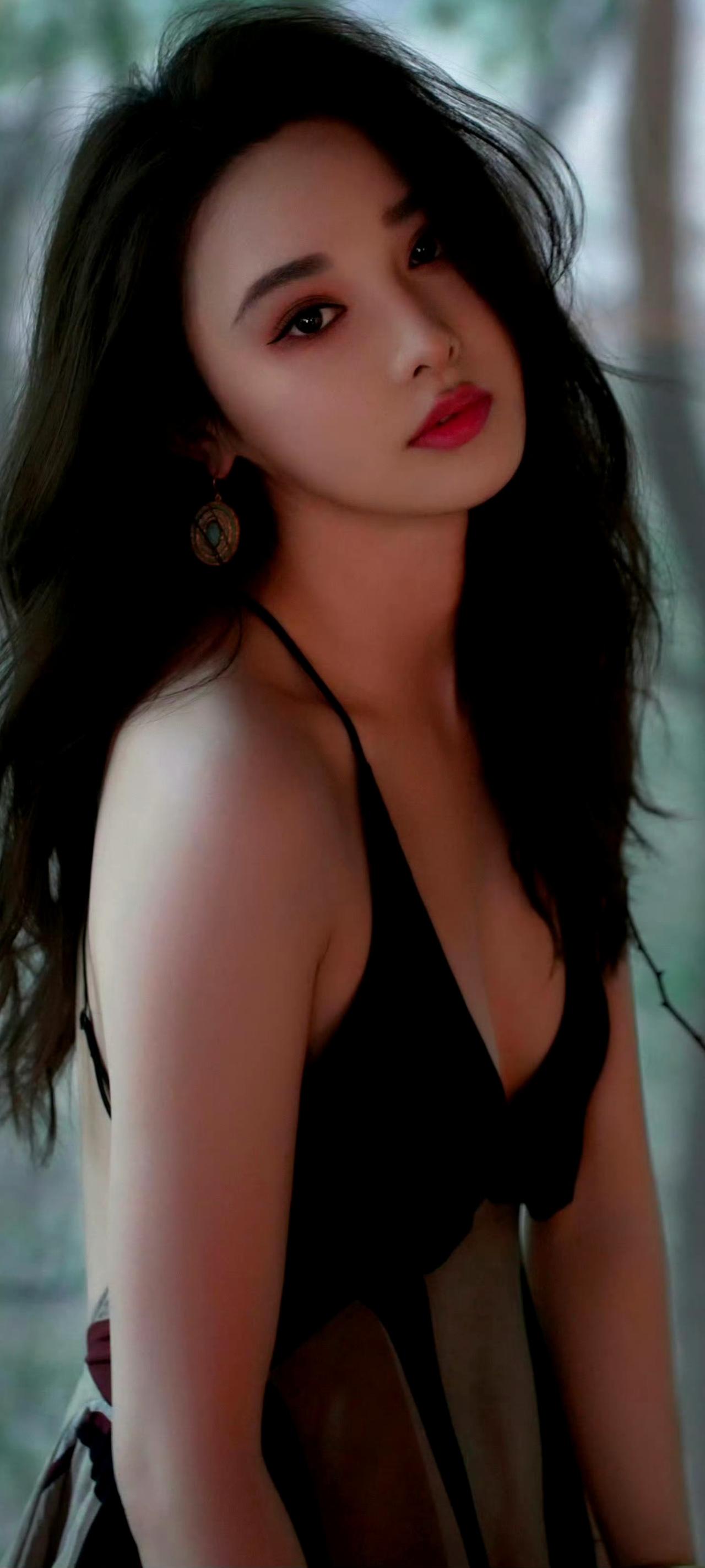优雅黑裙,红唇魅惑,森林中的神秘女神。彭小苒 明星穿什么 好身材性感女神 你心目