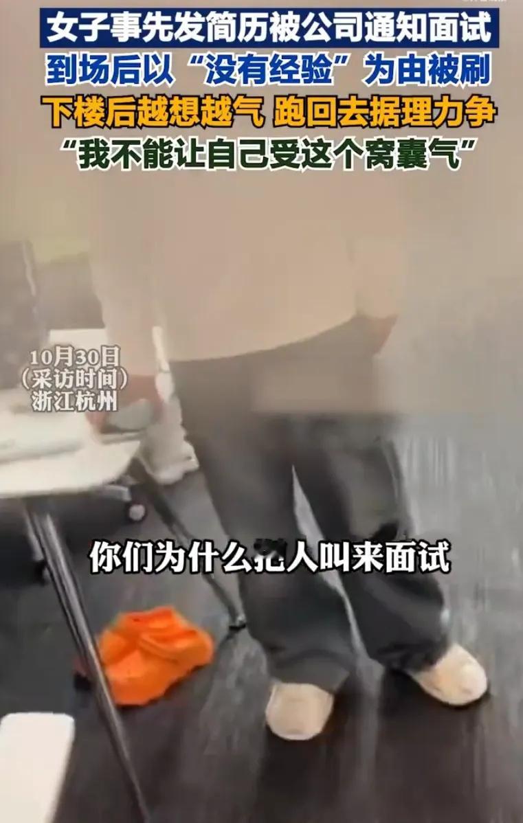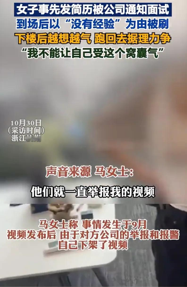 女子事先发简历被通知面试,到场后因没经验被刷:越想越气发网上吐槽遭举报 坐标:浙江杭州。10月30日马女士事先发简历被某科技公司通知面试,到场后却以“没有经验”为由被刷,下楼后越想越气,便跑回去据理力争,并录下视频 “我不能受这个窝囊气,想要一个说法。”当事人马女士称。随后马女士将现场录屏发布到网上,视频发布后由于对方公司的举报和报警,自己下架了视频。马女士认为自己并没有侵犯对方权益或捏造事实,因此又重新发布了视频 大家觉得公司和马女士的做法,谁对谁错呢?请发表你的观点 .