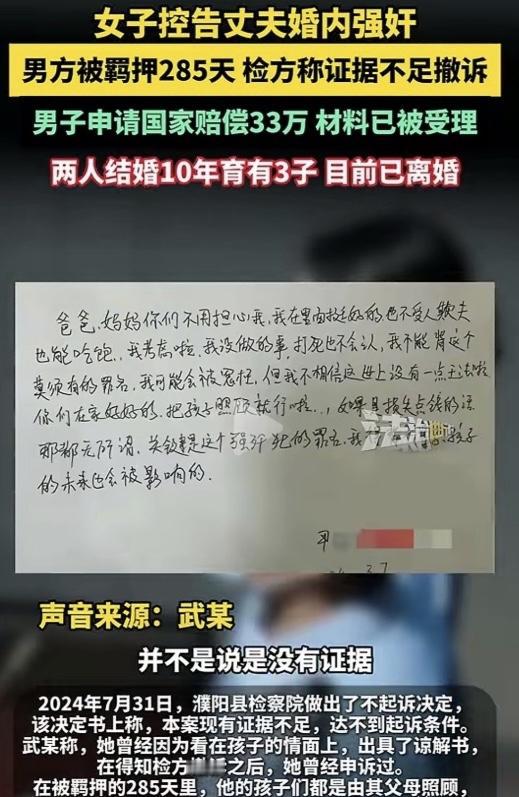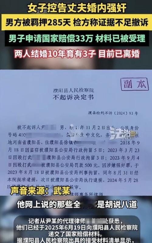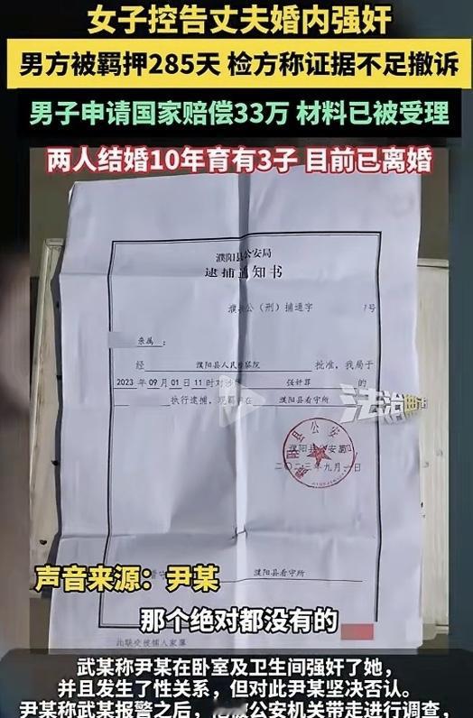 在河南省濮阳市,尹先生与武女士于 2013 年依法登记结婚。在长达10 年的婚姻关系存续期间,二人育有三个子女。然而,随着婚后时间的推移,夫妻二人矛盾逐渐凸显,婚姻生活过得十分艰难。 至 2023 年,武女士因实在无法忍受现有的婚姻状况,先后两次向法院提起了离婚诉讼。但因所提供的证据未能充分满足离婚诉求的证明标准,两次离婚诉求均被法院予以驳回。武女士虽满心委屈,也只能无奈接受这一结果。 2 月 4 日晚间,夫妻二人再次就离婚问题爆发了激烈争吵,在情绪极度失控的状态下,双方发生了肢体冲突。武女士在此次冲突中受伤后当即报警,公安机关依据相关规定,对尹先生作出了拘留 3 天的行政处罚决定。尹先生对此处罚表示愤愤不平,在拘留期满释放后,依法申请了行政复议。 7 月 26 日,庭审结束后,尹先生与武女士一同回家。在返回途中,尹先生依旧对离婚一事心存怨愤,且情绪愈发激动。到家之后,尹先生看到武女士出现干呕症状,随即心生猜忌,无端怀疑武女士存在出轨行为。 基于自己这种毫无事实依据的主观猜测,尹先生为寻求所谓证据,在冲动之下决定自行取证。他一边拍摄视频,一边强行冲过去将武女士压在身下,用力吸吮其脖子部位,妄图以此方式留下所谓“出轨证据”。 武女士面对这突如其来的暴力行为,惊恐万分,奋力反抗后终于挣脱,迅速跑到阳台上大声呼救并报警,声称遭到尹先生的侵犯。而尹先生则站在一旁辩解,称自己并未脱衣,也未与武女士发生性关系。 8 月 18 日,尹先生因涉嫌强奸罪被公安机关依法刑事拘留,随后被送往看守所羁押。尹先生未曾料到,自己原本想证明妻子出轨,最终却沦为犯罪嫌疑人。在看守所中,尹先生日日期盼能够重获自由,不断反复回想起事发当晚的种种情形,坚称自己并未做出过分的行为,并表示出去之后一定要查明事情真相,还自己一个清白。 就这样,尹先生在看守所内被羁押了长达 285 天。这漫长的 285 天对尹先生来说,无异于度日如年,每日都在痛苦与煎熬中度过。 最终,检察机关经过全面、细致、严格的审查,鉴于现有证据不足以认定尹先生构成强奸罪,决定撤回该案。至此,尹先生才得以走出看守所,恢复人身自由。但此次事件对尹先生造成了极为严重的影响,他不仅失去了工作,个人名誉也遭受了极大损害。 尹先生认为自己遭受了极大的委屈,认为造成如今这一系列严重后果的原因在于武女士报警所致,遂决定提出赔偿申请。2025 年 5 月 29 日,尹先生正式向相关部门提交了赔偿申请,在申请材料中详细阐述了整个事件的来龙去脉,期望能够得到公正、合理的赔偿结果。 9 月 22 日,尹先生收到了赔偿款项。这笔赔偿款虽然在一定程度上能够弥补其部分经济损失,但却无法挽回他所失去的宝贵时间以及已经遭受严重损害的名誉。 本信息来源:九派新闻、法治进行时。河南婚姻闹剧 河南婚姻故事 郑州婚姻趣事