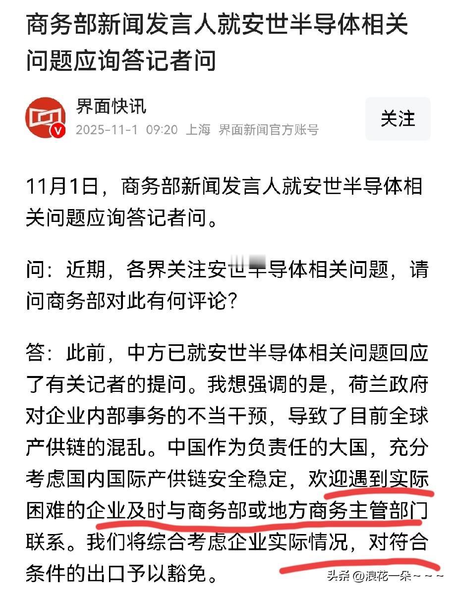 提气!一大早,就看到商务部发言人又对安世半导体相关问题应询进行了答记者问!看得我是心潮澎湃,荷兰政府再不悔改,执意顽固下去估计要黄黄了? 说直白一点,荷兰就是一个小国家,经济实力现在也就比我们江苏省强那么一点点,你胳膊还能扳得过大腿?等我们光刻机突破了,你们那个阿麦斯半导体公司去喝西北风吧?时间不会等太久。