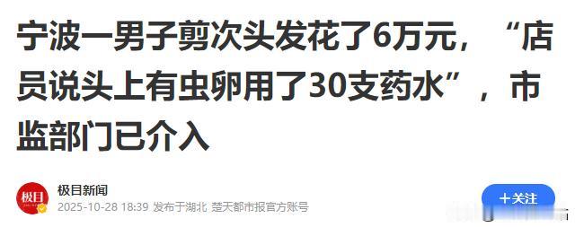 “防不胜防!”10月24日,浙江宁波,一男子到理发店里理发,本以为最多也就花100块钱,没想到店员却表示他的头上有虫卵,给他推荐使用了30多支药水“驱虫”,结果最终男子花了60000元!网友:含泪赚了59800啊。 10月24日下午,浙江宁波一位消费者走进一家街边理发店,本想花几十块钱理个发,谁知这一进门,却被一套精心设计的话术牵着走,最终支付了6万元的天价账单。 坐下后,店员说他头上有红疹,可以免费检查一下,随后拿出显微镜查看,告诉他头皮上有“虫卵”,并描述了各种可能的危害,周围几个店员也围上来,强调要尽快处理。 在这种氛围下,店员开始使用所谓的“除虫药水”,一支接一支,用了30支,等到结账时,消费者才知道每支药水880元,总共2.64万元,看到账单后他有些懵,但店员立刻抛出新的方案。 店员表示可以办理6万元的套餐,不仅能抵扣刚才的药水费用,还包含后续的治疗项目,听起来像是“白送”的优惠,消费者在连番话术下最终付了款。 回家后他越想越不对劲,头皮上真有虫卵吗?为什么用了30支药水?这些所谓的治疗到底是什么?第二天他向相关部门投诉,宁波市市场监管局高新区分局随即介入调查。 这类消费陷阱在美容美发行业已经形成了固定套路,第一步是用“免费”服务吸引顾客,比如免费头皮检测、免费护理体验。第二步是制造焦虑,声称发现了什么问题,渲染不处理的严重后果。 第三步是在未明确告知总价的情况下开始使用产品或服务,很多消费者以为只是简单处理一下,等结账时才发现金额远超预期,第四步是推销高价套餐,用“优惠”“抵扣”等话术让人觉得不办反而亏了。 类似的投诉其实不少,有人去理发被推销头皮护理,花了上万元;有人去洗头被说头发受损严重,办了几千元的护理卡;还有人去染发被加了各种项目,最后账单翻了十几倍。 面对这种情况,消费者首先要记住:任何“免费检测”都可能是套路的开始,进店前最好看看价目表,心里有个底,如果店员在服务过程中推销产品,一定要问清楚具体价格和数量。 不要被“免费”“体验”“优惠”这些词迷惑,天下没有免费的午餐,所谓的免费检测往往是为了找出“问题”,然后推销高价产品,如果对方开始使用产品而你并不清楚价格,可以立即制止。 “好家伙,理个发花了6万?这哪是托尼老师,分明是“头皮刺客”啊!我算看明白了,现在的理发店套路比发型还多,进去之前说好几十块,出来就能让你大出血。” “这种“免费检查→吓唬有虫卵→天价药水→捆绑套餐”的流程也太熟悉了!跟我去年遇到的简直一模一样,只不过我当时被忽悠了2000块就赶紧跑了,这帮人专门挑单独去的顾客下手,几个店员围着你七嘴八舌,普通人一紧张真的容易上头。” “最可气的是他们专挑健康焦虑下手,什么“虫卵”“红疹”听起来吓死人,其实八成是编的,真要头皮有问题,不该直接劝人去皮肤科吗?880一支的药水怕不是金子做的,用30支也太夸张了,这摆明了是看人下菜碟。” “宁波这事儿居然不是第一次了!今年3·15还曝光过同一家店用同样套路坑了人近70万,这种店为啥还能开着?罚酒三杯根本不管用,得重罚到他们肉疼才行!杭州之前整顿“天价理发”后风气就好多了,宁波也得动真格啊。” 你在理发店被推销时,是怎么成功反套路的?快来评论区教教大家! 信息来源:极目新闻