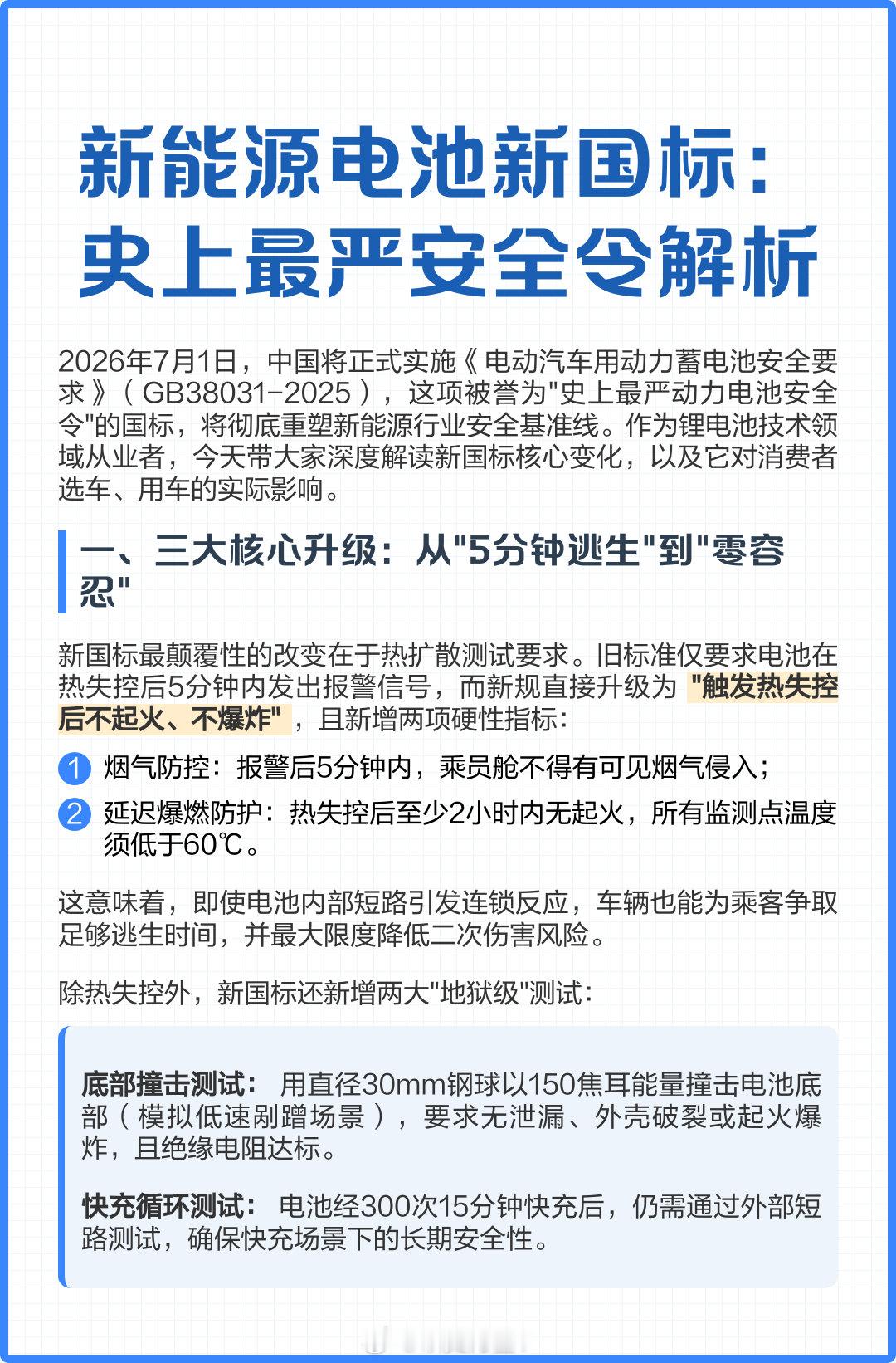 用户对电池自燃的担忧也催生了新的国家安全标准——将于2026年7月1日正式实施的《电动汽车用动力蓄电池安全要求》,号称史上最严汽车电池安全令。