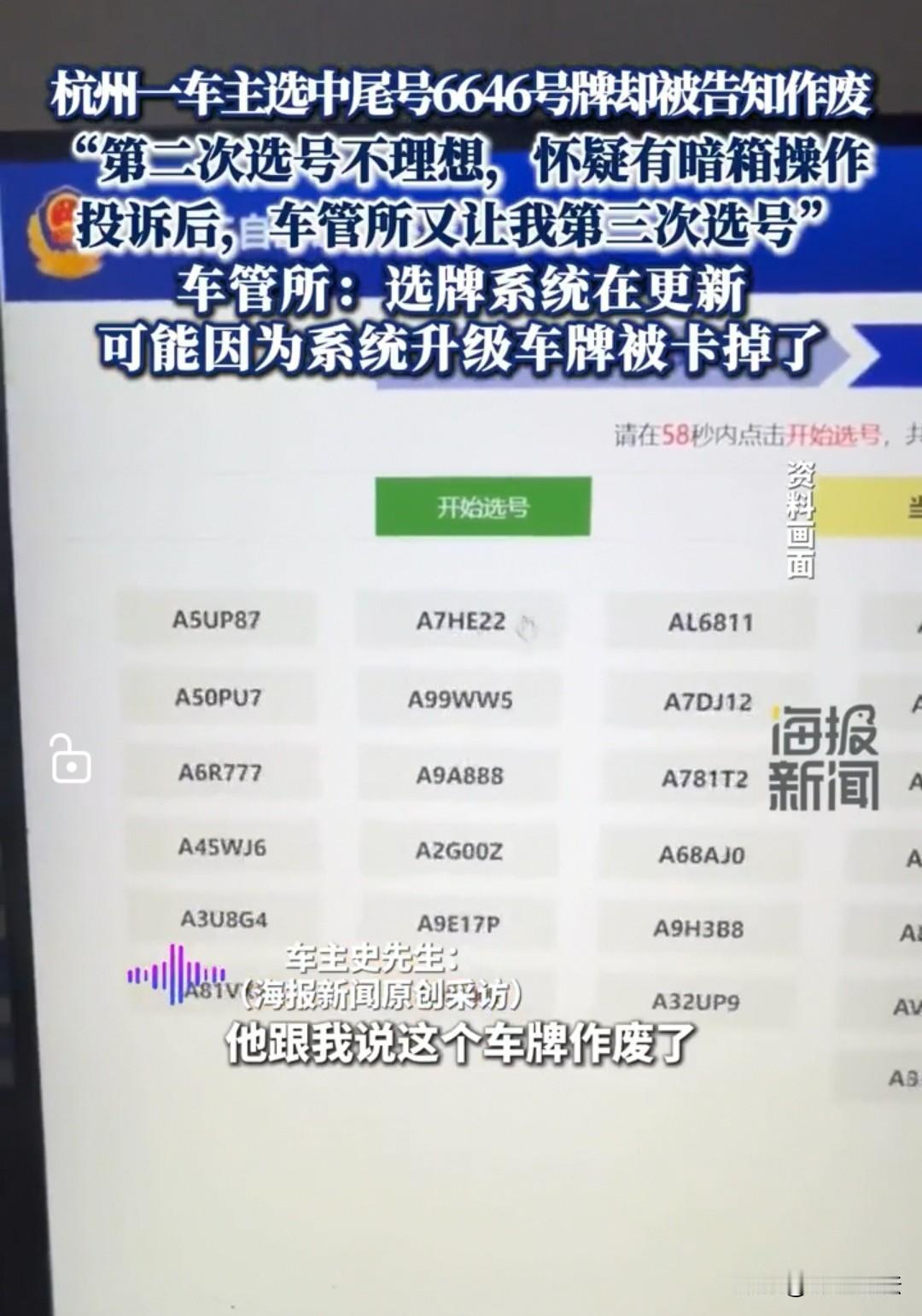 杭州,一车主选中6646,却被告知这个号作废,让他重新选。可第二次选号的话,他不中意,他觉得是不是在暗箱操作?最后,他投诉车管所,对方又让他第三次选号,结果他还是不满意,他就想要6646这个号,可对方说没有了,可能是系统升级,车牌号被卡掉了。 素材来源于:海报新闻2025年11月1日报道。 男子买了一辆新车,就想给它配一个中意的号码,于是选了一天,自认为非常幸运的日子,就来到了车管所,为自己的新车选号码。 他瞬间就被6646这个号码吸引住了,觉得这个号码肯定会给自己带来好运,会让自己在拥有新车的这段时间,一定会顺顺利利的。 因此,他赶紧选中了它,还兴奋地想要打电话告诉家人,告诉他们真的选到了自己心仪的号码。 可是手机还没摸出来,工作人员告诉他:“你这个号作废了,不能使用。” 男子瞬间从天堂坠入谷底:“怎么回事呀?这个号不是自己选中的吗?怎么就作废了?你们必须给我一个理由!” 对方和颜悦色地说:“可能系统升级把号给卡掉了,你重新选吧,说不定还能遇到中意的呢。” 男子心想:第一次就选中了6646这个号,如果老天再让我选一次,是不是会有更好的号码呢?于是他就答应了第二次开始选号。 可是让他意外的是,这次的号码并没有自己中意的,眼睛都看花了,就是没有一个入眼。可能是先入为主的原因吧,自己第二次选号,却始终想到的是6646那个号,所以看现在的号,总觉得不入眼。 男子就怀疑:“你们这是不是有暗箱操作呀?那个号是不是被别人要了?所以看到我选中,你们马上就卡掉了?” 当然,这只是男子的猜测,没有实证。人家说系统卡掉了,又没有说人为卡掉了,你有什么证据证明人家就是作假呢? 男子气不过,直接投诉了对方,说:“我选中了号码,没了,让我第二次选,我又选不到中意的,他们的系统还直接关闭了,我现在选不了号了!” 经过这么一投诉,他的事情也被上层领导知道了,赶紧让下面的人重新让男子再选一次,不能让车主失望,毕竟人家选好的号被卡掉了,是我们这边系统的原因,要尽量妥善安抚和解决人家的问题。 最后,工作人员又安排男子选了第三次,其实这次他还是没有选中自己喜欢的。不过有什么办法呢?所有的流程都走了,6646这个号也不会再回来了,自己只能在现有的号码中选到自己相对满意的。 不过他事后把这个事情发布了出来,觉得这样太不合理了:“你要真的想把那个号保留,你就不要放出来让我看到,看到了又给我卡掉!” 表面上是系统卡掉,这个系统不也还是人工操作的?你们这样的回答确实不能让人信服,只能说明你们就是想保留那个号。 不过,网友们看到后有点傻眼了,不明白男子为什么就一定中意6646这个号?要说是6666,男子一定要讨个说法,那也还是情理之中的事情,现在6646不是很普通吗?自己的号码都比这个号码还要好。 有人表示,可能这个号码对男子来说有特殊意义吧,这个号码正好正中了他的心意,所以他才如此执着和纠结,想要讨要说法。 但也有人表示,既然男子喜欢这个号码,系统给它卡掉了,那么这笔损失不应该由男子来承担,应该让工作人员再把那个号找出来给男子,这才是正确合理的解决办法。 如果男子只是看到没选中它,那是他胡搅蛮缠,可是人家已经按下了确定键,选中了它,那这个号就应该是他的,工作人员就应该纠正自己的错误,不管是系统问题还是操作问题,都应该给个合理的解决办法,而并不是一味地让别人重新选、重新选。 一、车管所告知男子6646作废,属于违约行为。 根据《民法典》第四百九十一条规定:当事人采用信件、数据电文等形式订立合同要求签订确认书的,签订确认书时合同成立。 在车主通过选号系统选中6646号码并完成确认操作后,可视为与车管所就该号牌号码的使用达成了一种合同关系。此时,车管所单方面宣布号码作废,若无法提供合法有效的理由,可能构成违约。 二、车管所违反了行政行为的合理性和合法性。 依据《机动车登记规定》第四十三条规定:公安机关交通管理部门应当使用统一的机动车号牌选号系统发放号牌号码,号牌号码公开向社会发放。 如果车管所不能证明系统升级导致号码卡掉是不可预见、不可避免且不可克服的,那么其作废车主已选中号码的行为可能违反了行政行为的合法性和合理性原则。 根据《行政许可法》第八条规定:行政机关不得擅自改变已经生效的行政许可,除非符合法定条件和程序。车管所随意作废号码,可能侵犯了车主的合法权益。 三、车管所侵犯了男子的自主选择权。 根据《消费者权益保护法》第九条规定:消费者享有自主选择商品或者服务的权利。车主在选号过程中,有权自主选择心仪的号牌号码。 车管所因系统问题导致车主无法获得已选中的号码,且多次要求车主重新选号,这在一定程度上限制了车主的自主选择权,可能违反了消费者权益保护的相关规定。 对于此事,大家如何看待?素材来源于:海报新闻11月1日报道