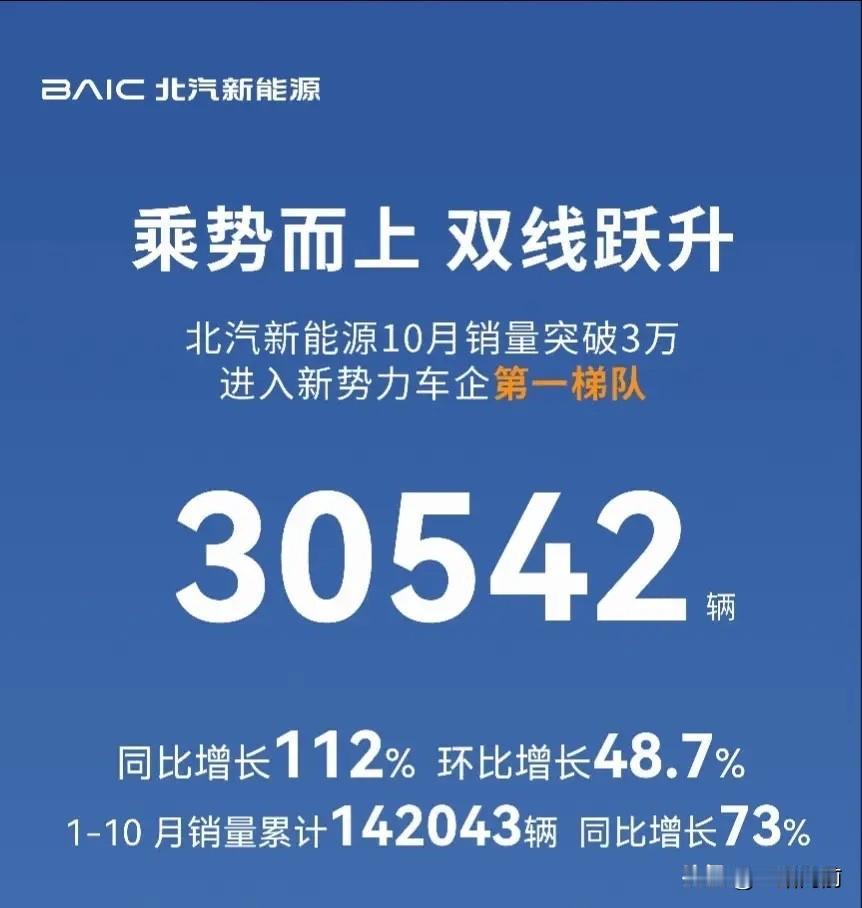 各新能源车企10月战报出来了 最先晒成绩的车企没一个拉垮的,全都是月销三万台往上走,尤其是零跑和北汽新能源,一个猛冲榜首,一个逆袭翻盘,看得人直呼过瘾。 先说说最炸的零跑,直接把销量干到了70289台,同比暴涨84%,这可是它首次突破七万大关,距离9月刚创下的六万纪录才过了一个月,涨势也太凶了。要知道去年这会儿零跑还在三四万区间徘徊,现在直接冲进全球新能源销量前十的门槛(全球第十吉利约7万辆),新势力销冠的位置算是坐稳了。 零跑能爆火根本不是靠运气,而是把“性价比”玩到了极致。比如入门级的T03系列,5.99万就能拿下403公里续航的版本,比同级别的竞品便宜小一万,配置还没缩水。高端点的C11增程版,二十万不到就能有超大空间和智能座舱,刚好戳中家庭用户的需求。更关键的是它全域自研的技术打底,电池、电机这些核心部件自己造,成本压得下来,自然能给消费者让利多。而且新车节奏也跟得上,D19刚开启预约,Lafa5马上要预售,A10还会亮相广州车展,这车型矩阵一铺开,销量想不涨都难。 再看北汽新能源,这波“后来居上”太惊喜了!10月交付30542台,不仅破了三万大关,同比还涨了112%,环比更是飙升48.7%,直接创下品牌史上最好成绩。要知道9月它才卖了20539台,一个月就暴涨一万台,这逆袭速度谁看了不佩服。 北汽的爆发全靠“双轮驱动”打得好。高端市场有享界S9T撑场面,作为鸿蒙智行的豪华旅行车,上市25天大定就破两万,还登顶30万+豪华轿车销冠,把BBA同级车型都甩在了身后。65%的用户是科技中产,超90%都是增购,不少还是从BBA转过来的,这说明高端路线走通了。主流市场更狠,极狐T1单月大定超3.5万台,6万多的定价精准踩中代步车需求,加上新款阿尔法T5预售破万,高低端通吃的格局一下就打开了。 其实这俩品牌的爆发,刚好反映了现在新能源市场的两个风口:零跑抓牢了“性价比+技术自研”的基本盘,用亲民价格满足刚需;北汽则靠“高端科技+主流走量”的组合拳,既挣口碑又冲规模。对比那些只靠单一车型撑场面的品牌,它们的抗风险能力明显更强。 不过话说回来,压力也不小。零跑虽然卖得多,但接下来要面对吉利、埃安这些老牌车企的围剿;北汽刚冲起来,得稳住品控和交付,别重蹈以前的覆辙。但不管怎么说,10月这波成绩已经足够亮眼,也让大家看到新能源市场不止有头部巨头,二线品牌照样能靠实力逆袭。