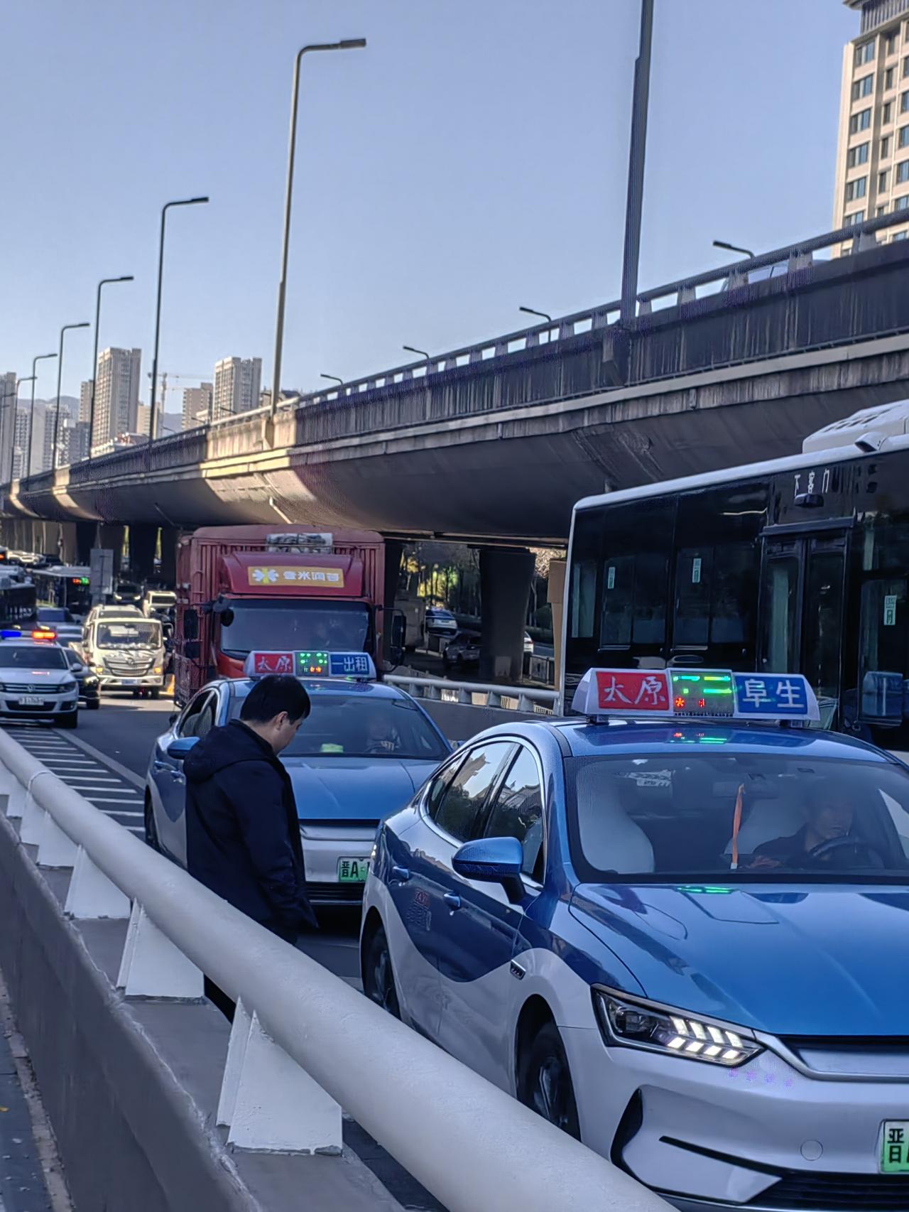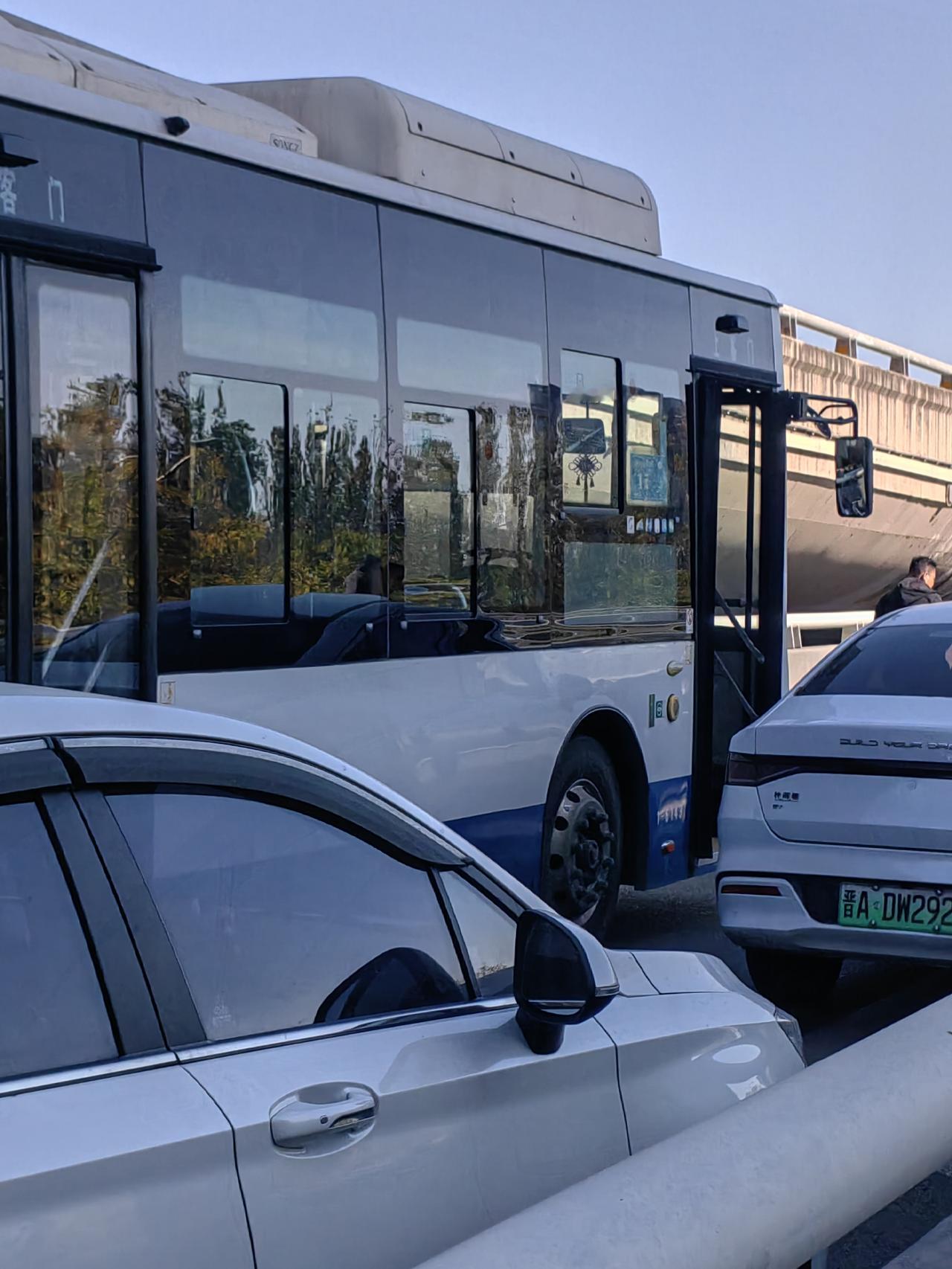 南中环桥西,从西往东引桥,发生车祸,三车相撞,两辆已靠边,一辆电动车卡路中央,堵了很多车,光是公交车都有十几辆。