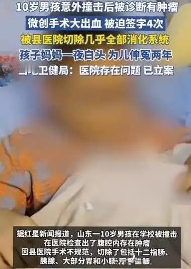 这真是个听着就让人揪心的事。一个才10岁的男孩,就因为一次意外受伤,人生彻底毁了。 事情发生在去年10月底,男孩受伤后查出肿瘤,在县医院做微创手术。谁想到手术中途突然大出血,家属被一次次叫去签字,短时间内竟然签了四次。每签一次,心里就凉一截。 最后的结果更是残忍——孩子几乎整个消化系统都被切除了。十二指肠、胰腺、大部分胃和小肠都没保住。这意味着他这辈子再也不能正常吃饭喝水,只能靠输营养液活着。想想都难受,一个正在长身体的孩子,连最基本的吃喝都成了奢望。 他妈这两年为了讨个说法,头发都急白了。最近总算有点进展,当地卫健局承认医院存在问题,已经立案调查。 说实话,微创手术做成这样,实在让人难以接受。医院在手术方案、应急处理上肯定有责任。孩子还这么小,未来的路该怎么走?长期靠营养液维持,对身体发育影响多大?这些后果想想都沉重。 医疗事故背后,毁掉的往往是一个家庭的全部希望。希望这次立案能真正查清责任,给孩子一个交代。也提醒大家,遇到重大手术时一定要多问几家医院,了解清楚风险。毕竟健康这种事,真的赌不起。