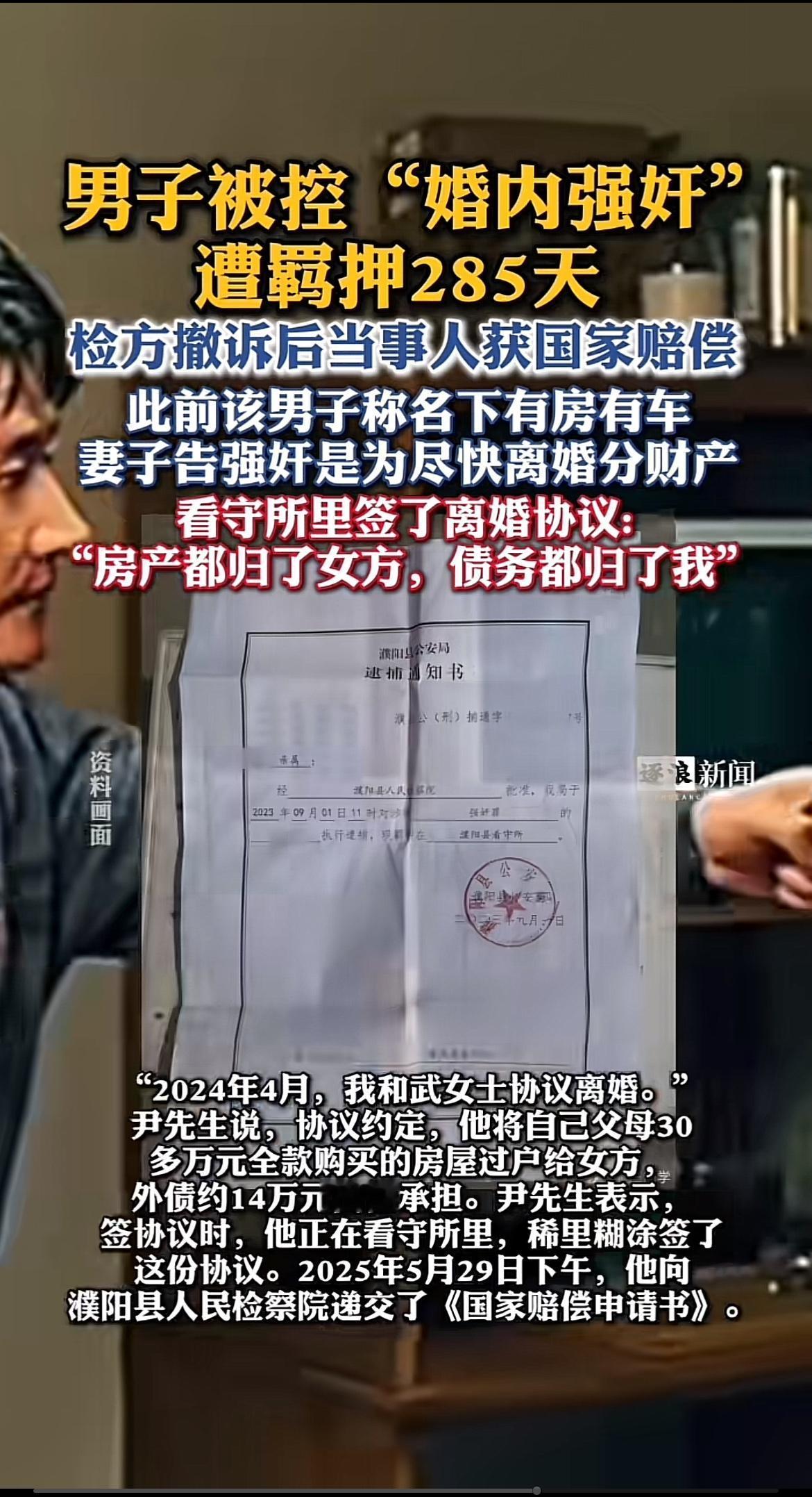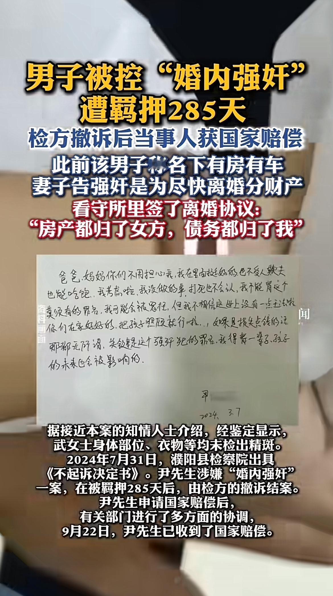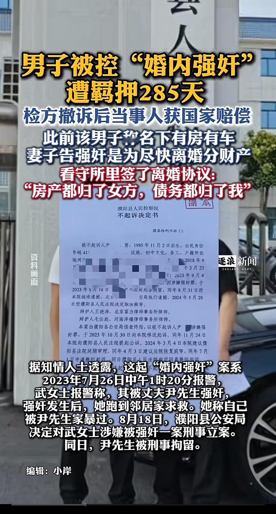 河南濮阳这起“婚内强奸案”太抓马了。1985 年出生的尹先生和妻子武女士结婚 10 年,育有两女一儿。2023 年 3 月武女士起诉离婚,还称尹先生长期家暴,尹先生却不认可。 2023 年 7 月,尹先生被指控在家中卧室强奸已分居的妻子。他被羁押 285 天后取保候审,检察院因证据不足不起诉。事后鉴定双方身上互有对方 DNA,武女士颈部有淤血。武女士认为尹先生内裤上有自己的 DNA 就是证据,否认诬告。今年 10 月 31 日,尹先生获国家赔偿,他表示事情已了,接受赔偿结果。这案子真是让人唏嘘。