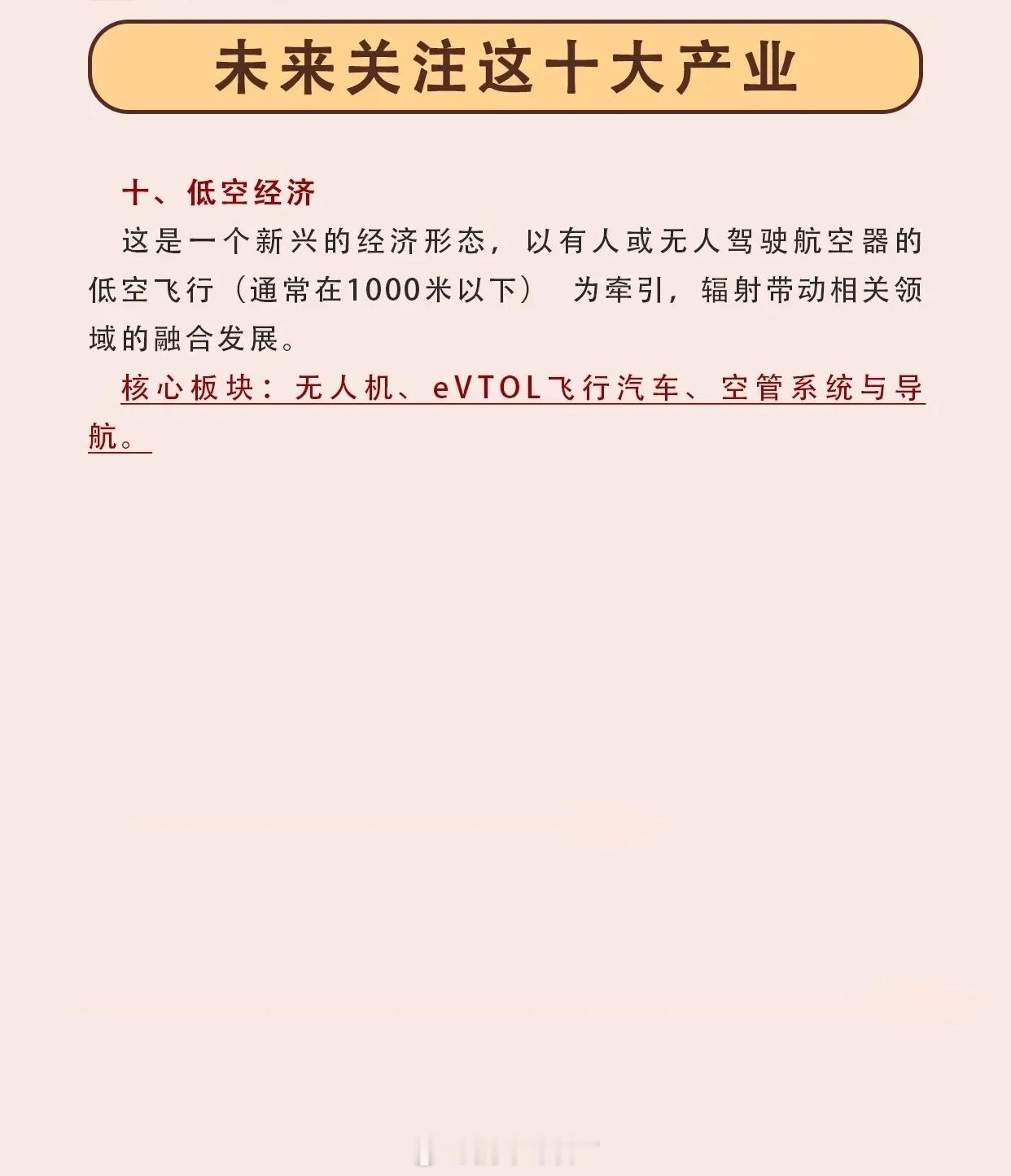 10. 低空经济:以1000米以下空域航空器飞行为牵引的新兴经济形态,辐射带动无人机、eVTOL飞行汽车等领域融合发展。