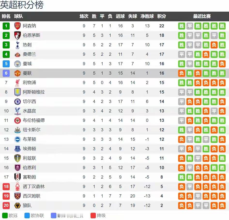 积分榜形势:英超9轮战罢,诺丁汉森林仅1胜2平6负积5分,排名第18位,深陷降级区;曼联则以5胜1平3负积16分位列第6,处于欧战资格竞争行列。