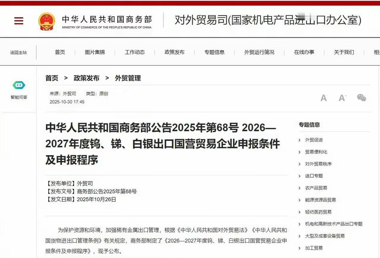 送走特朗普,中国率先出招了。商务部发布对钨、锑和白银的出口管制措施。稀土兑子暂停一年,但这三种金属不属于稀土,所以没有违反会谈结果。嗨,您猜怎么着?这牌越打越多了。这有色金属,也是我们的牌。 有网友说:钨锑白银出口管制,就是管制稀土重要元素。美国的话不能全信。放开一年后,中国稀土就不值钱,沒有筹码。自己要慎重放开稀土元素。 我估计美也会继续出牌,先把我们最大的牌锁进协议的盒子里,不在协议范围内的继续出,所以我们还要继续找,大不了到明年砸开锁重来,那这一年一年的时间就特别重要了,军工,科技,金融都需努力 很多东西是不需要公开管制的,比如大豆没说过不买,但真能做到一斤也不买。因为主要交易方就是国企,内部交流即可。 中国钻石也是美欧高科技企业离不开的由中国垄断的硬材料。已经有条件的限制供应了! 大家怎么看呢?