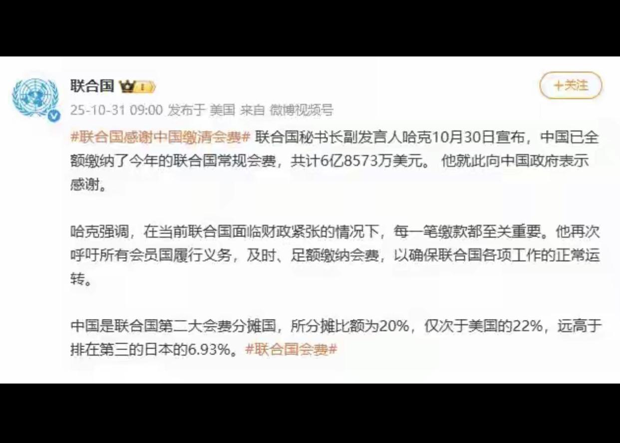 联合国感谢中国缴清年度会费! 美国则已拖欠联合国会费超30亿美元! 目前联合国会费分摊比例: 美国第一,22% 中国第二,20.004% 日本第三,6.93% 德国第四,5.692% 英国第五,3.991% 第六至第十位依次为法国(3.858%),意大利(2.813%),加拿大(2.543%),韩国(2.349%),俄罗斯(2.094%)。 美国自2013年以来就从未缴清过当年会费,时间跨度超12年,且采取的欠费手段非常精准,总是将欠款总额控制在《联合国宪章》第19条规定的不超过前两年应缴总和的红线之内,以保留联大投票权。 截止今年,美国已以精准欠费方式拖欠联合国会费共计超30亿美元! 所以,美国不是完全不缴费,而是长期故意不全额缴,长期拖欠。这种阳奉阴违的做法明显是把欠费当作了政治工具使用。 联合国 美国联合国代表 中国联合国 中国联合国地位 联合国费用 美国会费拖欠 54届联合国