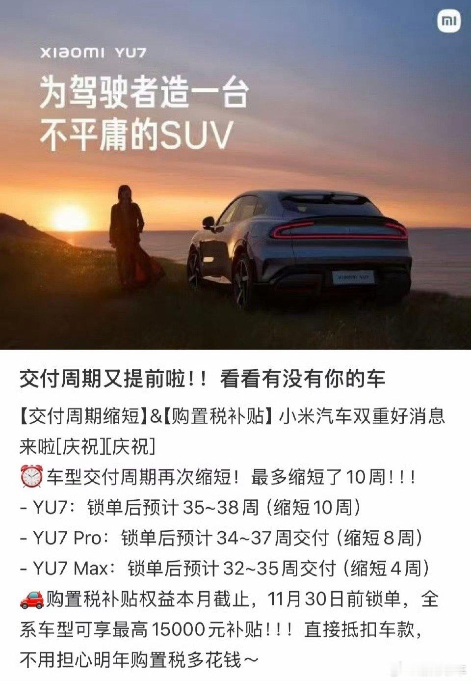 YU7锁单后预计35~38周,较原定周期缩短10周,YU7 Pro锁单后预计34~37周,较原定周期缩短8周,YU7 Max锁单后预计32~35周,较原定周期缩短4周