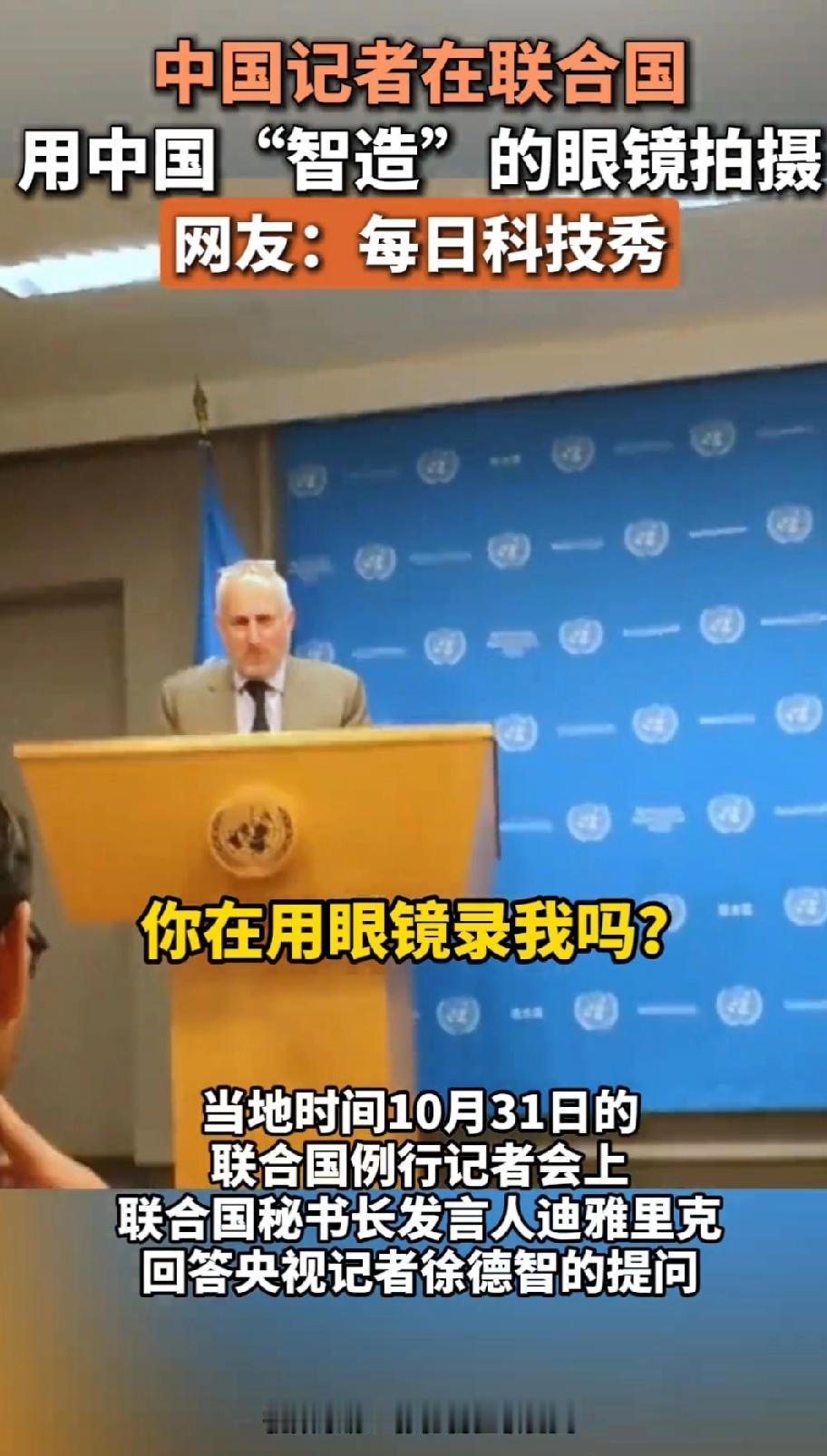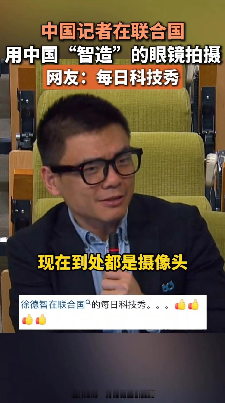 不服不行啊。中国驻联合国记者@徐德智在联合国 徐德智携带“私货”,直接把联合国发言处干成了中国科技每日秀。[我想静静] 三天两头给那些没有见过世面的老外秀中国的高科技新产品,什么三折叠手机,什么稳定器,什么折叠电脑,那些外国同行的口水都快让哈德逊河水暴涨了。[笑哭][笑哭][笑哭] 这次这个应该是AI翻译眼镜吧?怎么是摄像头呢? 点右上角关注我,我们一起去看这个魔幻的世界