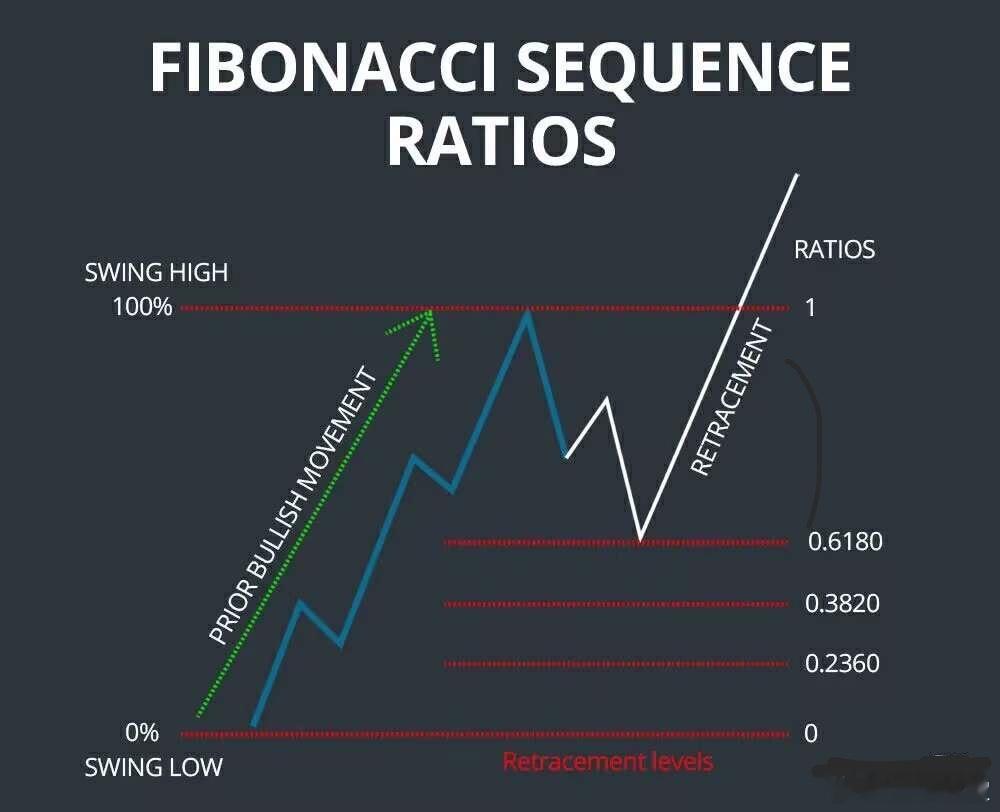 其中,每个数都是前两个数之和。当将相邻数字的比率计算出来时,会发现它们逐渐接近 0.618(黄金比例),而其他比例如 0.382、0.236 也是常用的比率。