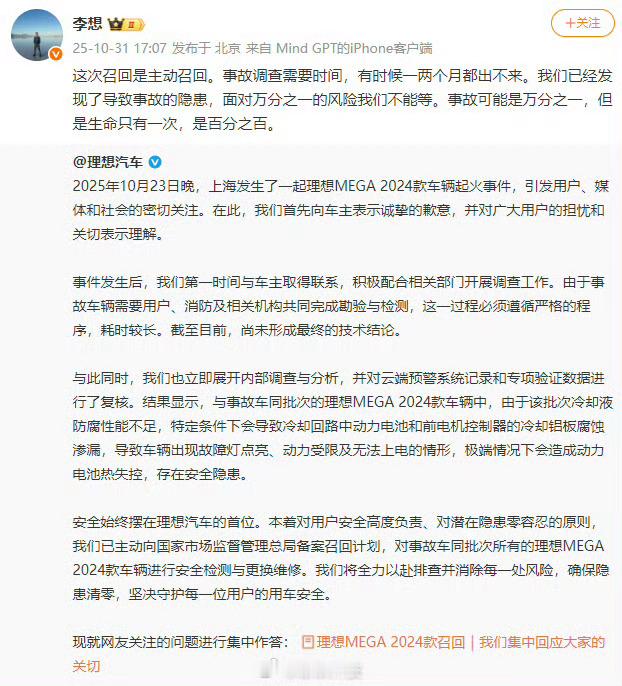 李想称万分之一的风险不能等积极承担责任这波理想还是OK的积极召回,不回避,不隐瞒