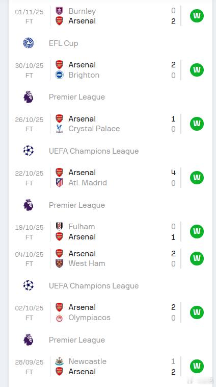 阿森纳9月底客场2-1击败纽卡斯尔之后,各项赛事连续7场零封,已经实现了9连胜。