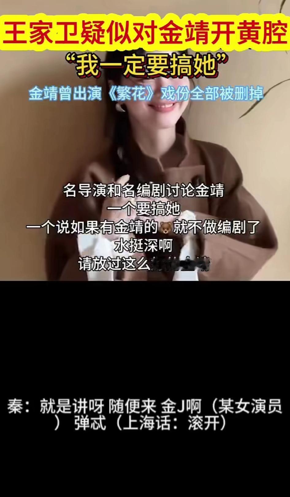 王家卫疑似对金靖开黄腔“我一定要搞她” 金靖曾出演《繁华》戏份全部被删除。 王家卫这次真是人设崩塌!前剧组人员“古二”放出的录音,把他从神坛拽进泥潭。 内地男女演员被他糟蹋一遍,也不知道真像他说的那样不堪,还是有人搞“眼镜” 故意把娱乐圈搅混! 他在录音里对众多明星评价恶劣,说唐嫣“很装”,可唐嫣为《繁花》推了三年剧本;说陈道明“阴阳同体”,还吐槽其改台词背不下来;连90岁的游本昌都被说“不是省油的灯”。 更离谱的是疑似对金靖开黄腔,说“我一定要搞金J”,而金靖曾出演《繁花》,戏份却全被删。网友纷纷指责他不尊重人。 金靖是喜剧人耶,怎么也会遭遇潜规则?看来在娱乐圈还是男演员安全些。 这录音流出,让王家卫往日高冷艺术家的滤镜碎了一地,曾经捧他的影评人也沉默了。 有人觉得公开私下聊天不厚道,但也有人说嘴脏就得认。