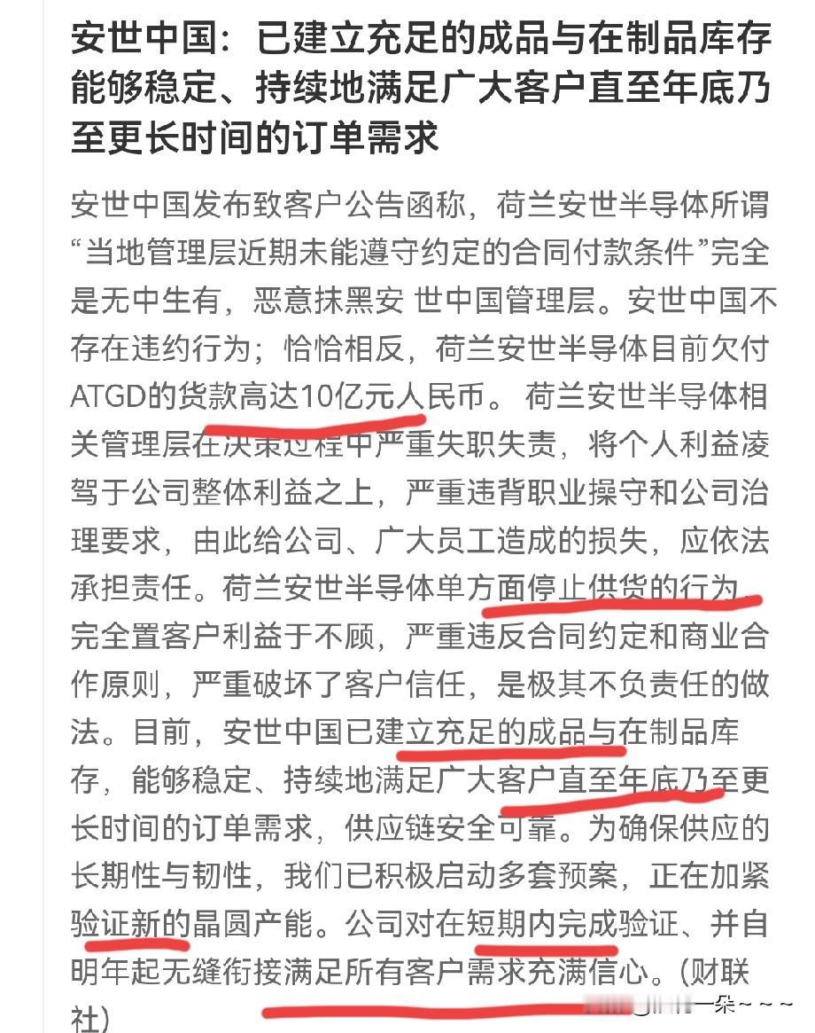 牛逼!很明确了? 荷兰安世半导体,以后喝“西北风”去吧?!就在刚刚,安世中国发布了致客户公告函,看了以后,对安世中国信心大增啊。 这也印证了昨天商务部的答记者问的内容,昨天商务部大意是说,欢迎有遇到困难的企业及时与我们联系,我们将根据企业实际情况,对符合条件的出口进行豁免。 看看今天安世中国的函,大意是我们现在仓库里还有很多充足的成品和在制品库存,供应到年底甚至更长时间都问题不大。 从这一点可以看出,目前来说根本不担心荷兰把晶圆产品断供的问题。 关键是最后一句,正在加紧验证晶圆新的产能,也就是说以后可能不会用荷兰的晶圆产品了吧? 只要是安世中国能够找到荷兰晶圆的替代品,再加上我们的封装技术和我们世界70%的客户。荷兰政府不是竹篮子打水一场空了吗?[捂脸]
