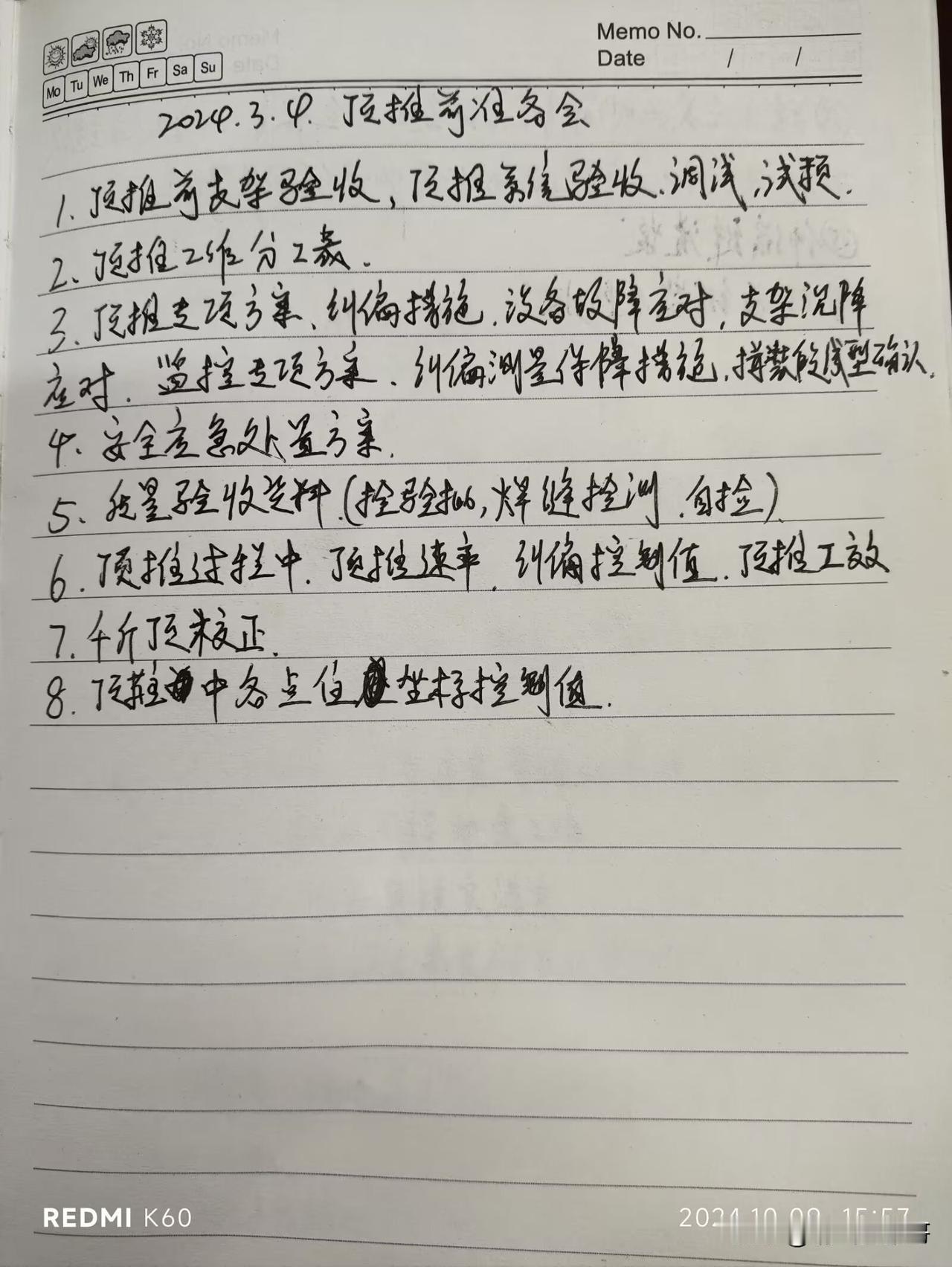 这是我去年拍的我一个同事的工作笔记,那个时候一起在一个跨河的钢结构桥梁项目,觉得他写的东西还算有用,所以才拍照存起来的。除了字写的差点,感觉基本上记录的都是日常管理工作的重点,最让我敬佩的就是他已经四十多岁了,还保持着这种记录工作重点的习惯,他经常说的一句话就是“活到老,学到老”,记笔记是他很早以前就养成的一种习惯。目前他又去了新的项目,但他教给我的一些好的工作、生活习惯,也在逐渐的影响着我。