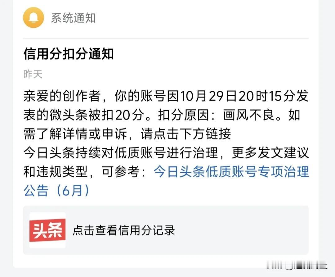 微头条被判“画风不良”,直接被扣20分,我通过答题马上恢复20分! 微头条已经有5万阅读量,然后就被判罚-20分,在通知里有答题恢复,里面有单选+多选题,我果断答题全对,20分失而复得! 有同样被罚的,不要急,去通知里看看有没有答题恢复积分,如果有就没问题,100%通过! 答题必过方法没法写出来,怕又被罚,不过可以交流经验!