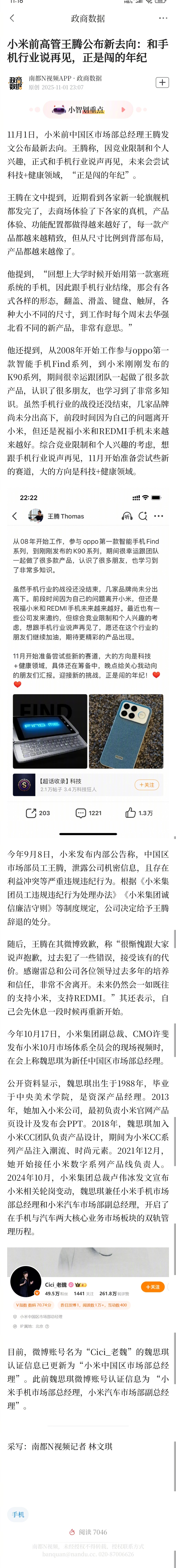 #小米前高管王腾告别手机行业#【小米前高管王腾公布新去向:和手机行业说再见,正是闯的年纪】#小米前高管称各家手机越来越像#11月1日,小米前中国区市场部总经理王腾发文公布最新去向。王腾称,因竞业限制和个人兴趣,正式和手机行业说声再见,未来会尝试科技+健康领域,“正是闯的年纪”。