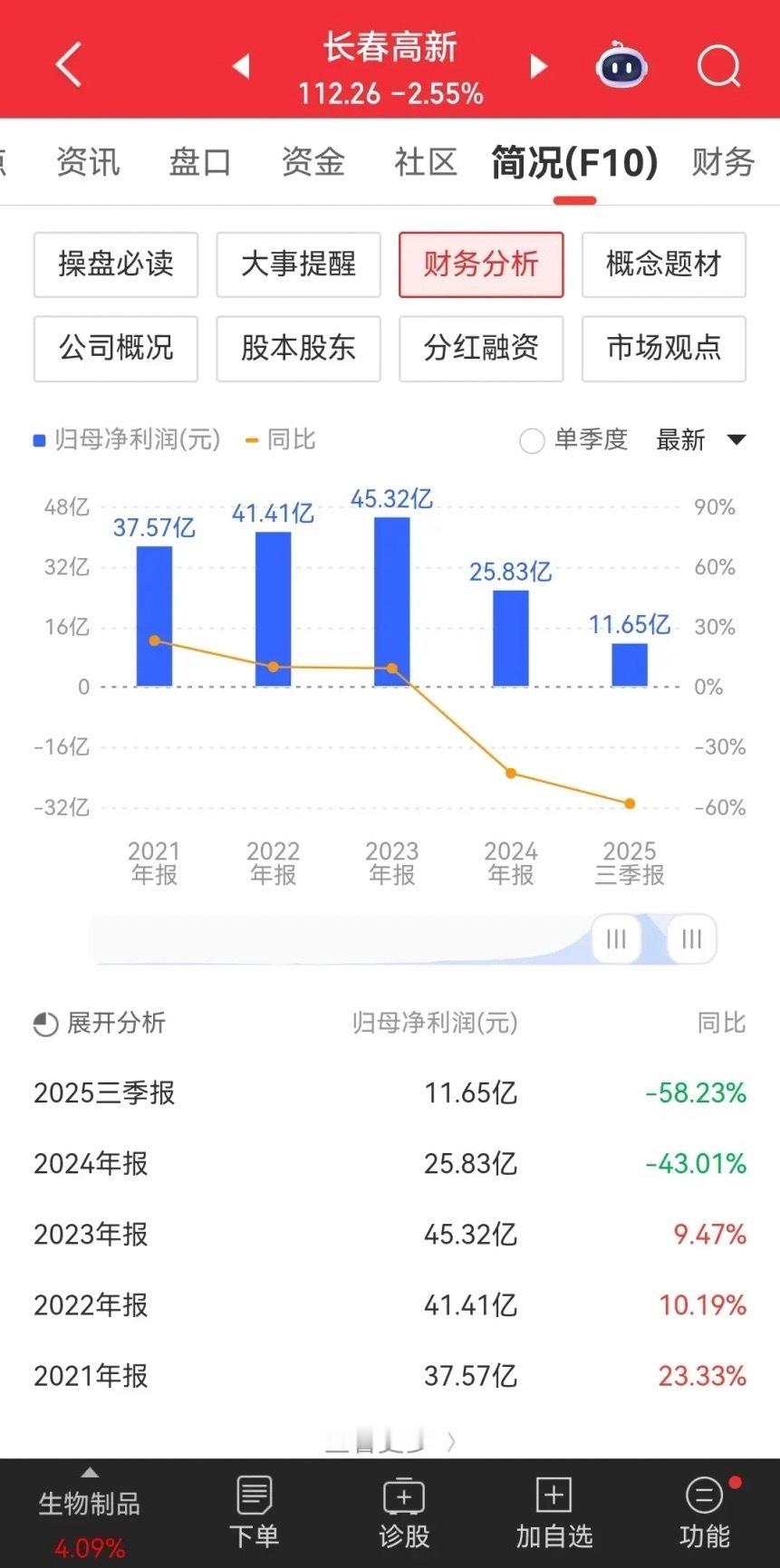 以长春高新为例,公司股价复权后历史最高价513.37元,最低跌到了74.94元,跌幅高达85%,如今股价也只有112元。最重要的是公司业绩开始大幅下滑,长春高新去年年报下降43.01%,今年三季报又下降了58.23%,业绩呈现恶化趋势,已经没有了成长和上涨的动力。
