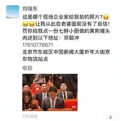 近期东哥要参加线下活动,结果被人拍了一张低头的照片。结果东哥发表,说让他在老婆面前失去了自信,需要点一杯外卖送到以下地址。东哥,还是那么开朗,大家怎么看?