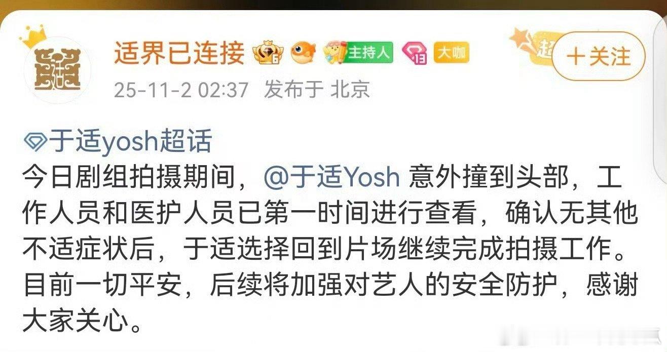于适昨天拍戏被对手戏演员不小心打到头,对接报平安了,拍摄顺利吧,安全是第一位的!