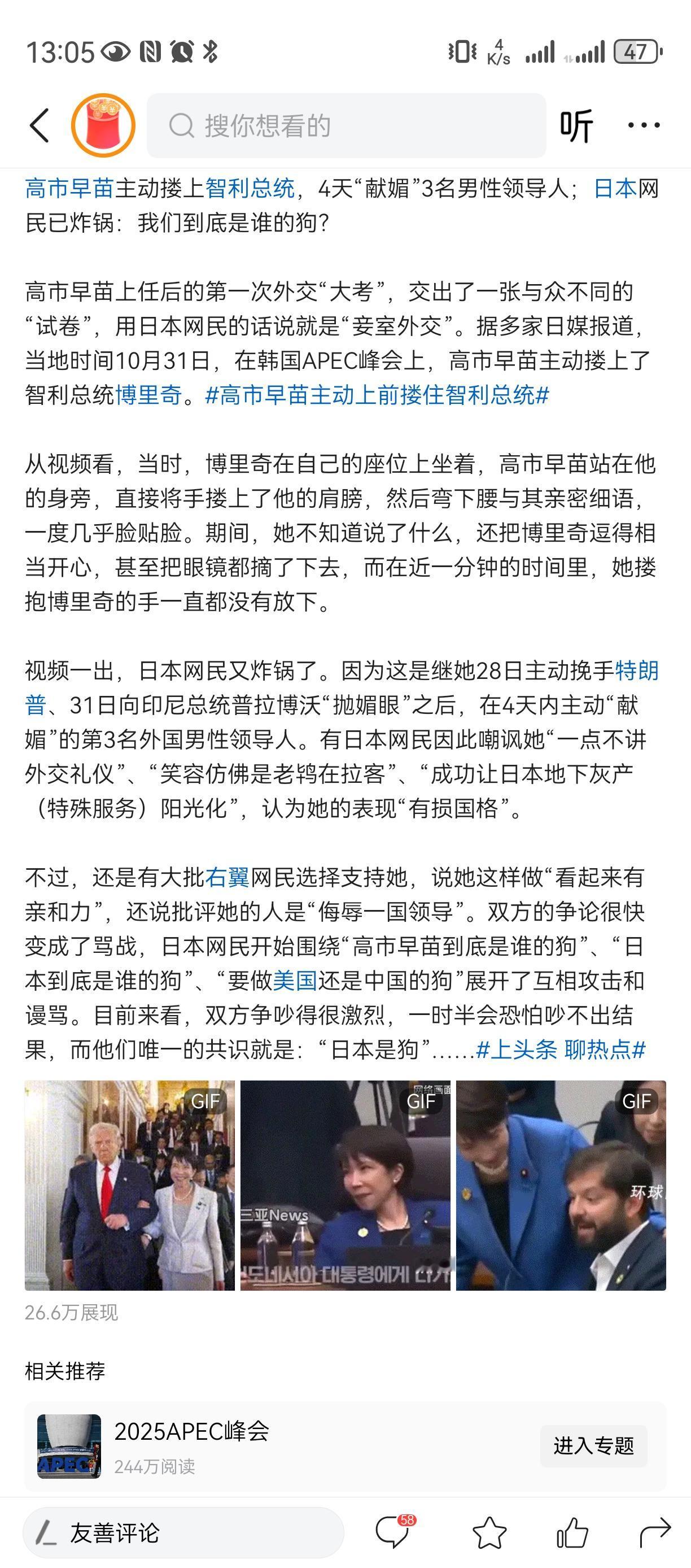 女性太难了[苦瓜]理解女人的不易 日本唯一女首相, 高市早苗, 一个靠自己坐上总理宝座, 抛开对中国态度, 本身是一个励志政治女性代表。 日本新任首相 就因为这次APAC上对几个男领导人, 又是抱胳膊, 又是抛媚眼, 还抱肩部。。。 展示得是女性领导魅力, 确被一些人喷 女性太难了。。 甚至说妈妈桑。。。