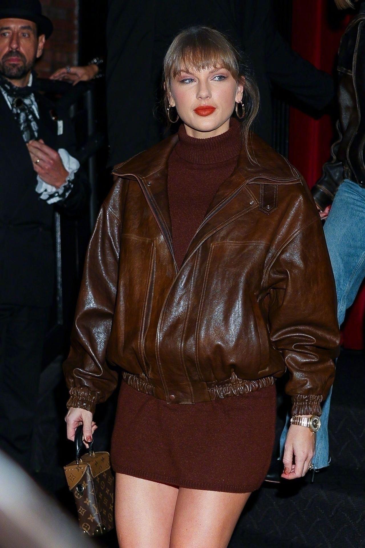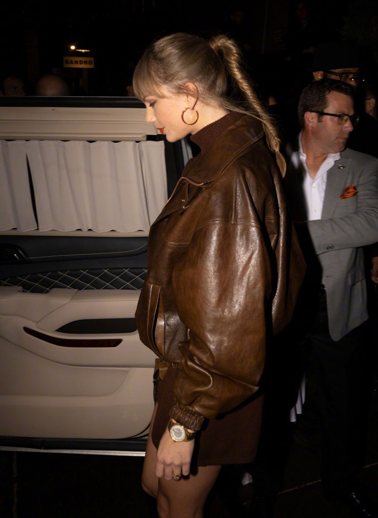 霉霉Taylor Swift离开纽约市 Chez Margaux 餐厅被拍,一身融合了同色系层次感的秋冬时髦配搭很抢眼。身穿Doen 深褐色羊绒迷你连衣裙,外搭Magda Butrym深棕色拉链皮夹克,脚穿Manolo Blahnik Lina麂皮靴,手拎Louis Vuitton相机包,佩戴Louis Vuitton 戒指和腕表⌚️、Nouvel Heritage 耳环、Artifex Fine Jewelry 的 老矿式切割钻石戒指,配搭精致的妆发,打造出了柔美与硬朗完美平衡的一身造型。最近似乎是请了私服造型师。米拉服饰解析