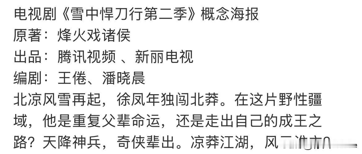 11月2日,《雪中悍刀行2》徐凤年感情线发展,红薯(孟子义)回归,与张若昀有感情戏! 《雪中悍刀行2》主线是徐凤年白发黑衣独闯北莽,深入敌后为北凉练兵的同时寻找母亲被害真相,这过程中完成从世子到北凉掌权人的蜕变,感情线有三位,姜泥,红薯,青鸟,最让我没想到的就是红薯,要知道第一部红薯扮演者是孟子义,当时的她还只是个名不见经传的小演员,客串了一个几分钟的角色,没想到第二部还跟张若昀有感情线,希望期待孟子义能参与第二部的拍摄!