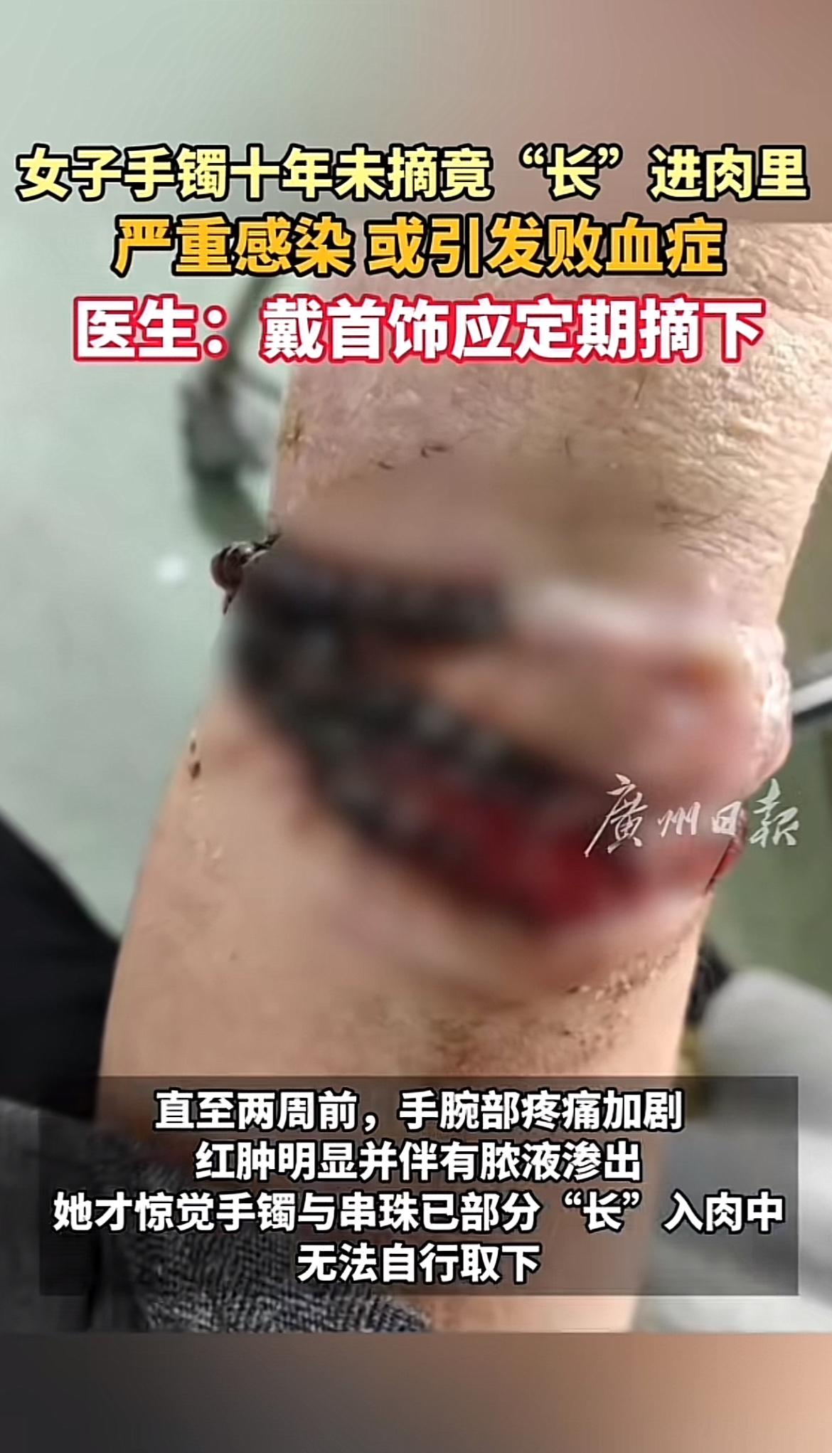 福建宁德33岁的龚女士,戴银手镯和串珠近十年几乎没摘过。随着体重增加,手镯勒进肉里她也没在意。直到两周前手腕剧痛、红肿化脓,才发现手镯已部分“长”进肉里。医生说这是首饰长期压迫摩擦、细菌感染引发的炎症。若不及时处理,感染可能蔓延,甚至诱发败血症或影响前臂功能。 好在手术成功,龚女士已顺利出院。医生提醒,戴首饰要定期检查清洁,胖了或怀孕水肿时及时调整,有不适症状马上摘下,劳动、运动或接触化学品时也最好取下。大家可别像龚女士一样疏忽啦!