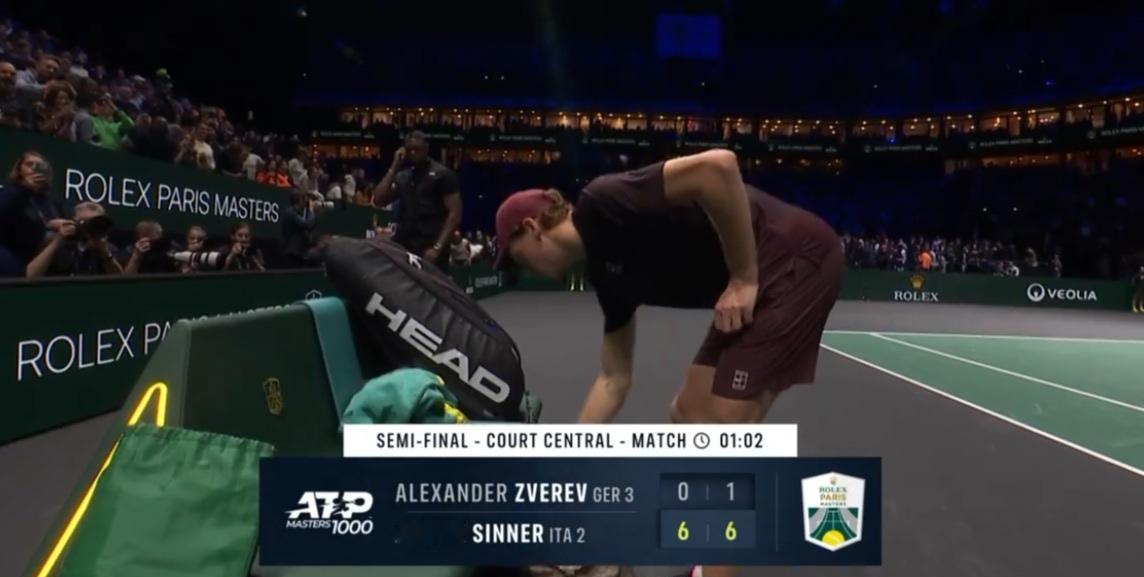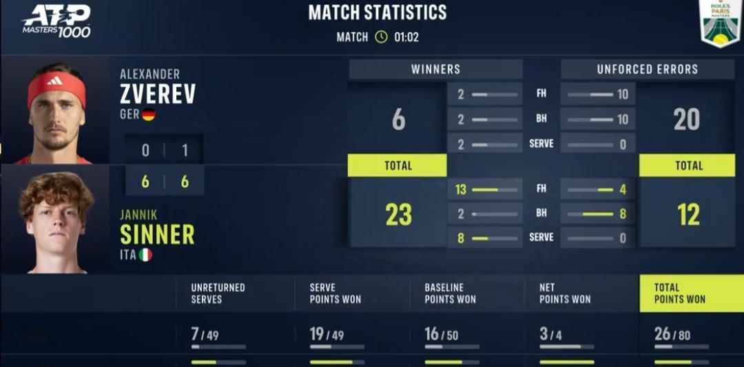 辛纳打兹维列夫,像砍瓜切菜。 62分钟,两盘拿下,一滴汗没淌。 发球像锁门,接发