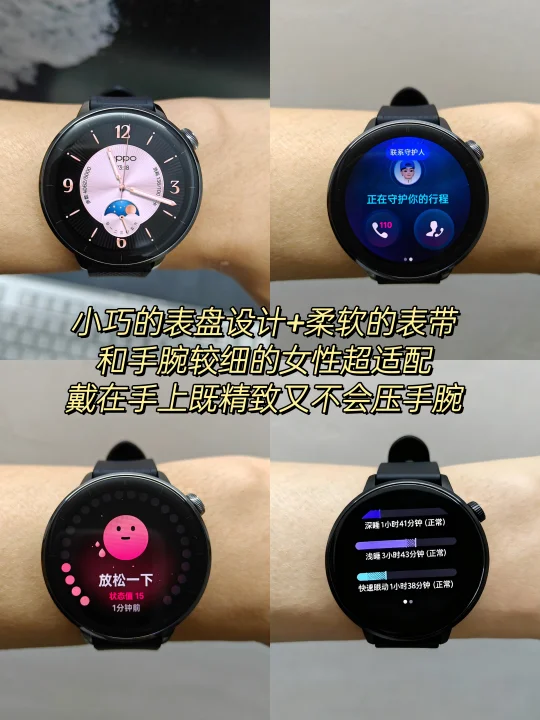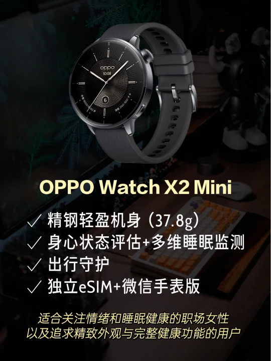最后是OPPO Watch X2 Mini,定位安卓小表表皇。尺寸仅43.2×43.2×11 mm,重量37.8 g,小巧轻盈。1.32英寸AMOLED显示细腻,345mAh电池在省电模式下续航约7天,全智能模式使用约2.5天。18K金精钢表壳(仅金表),黑色和银色为精钢表壳,搭配IP68+5ATM防尘防水,兼容独立eSIM,微信手表版,表盘丰富。它还内置了出行守护功能,可实时同步位置和心率状态给守护人。健康方面,它专注于身心状态评估和多维度睡眠监测,贴心关注情绪与休息,女性使用还可以帮助记录和管理生理周期。适合关注情绪健康、喜欢小尺寸圆表且预算中等的职场女性。
