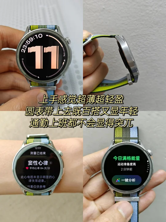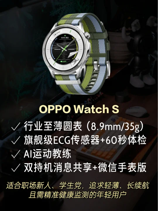 首先是OPPO Watch S,它不仅是行业Zui薄圆表,更以轻薄表皇之姿带来舒适佩戴体验。整体厚度仅8.99 mm,重量35g,几乎无感。一体精钢表壳,屏幕峰值亮度3000nit,户外强光环境也能看清屏幕。330mAh超薄电池支持约7天续航,最长续航可达10天,系统流畅。它还具备60秒体检、旗舰级ECG配置,并行业首发AI运动教练和行业独家副手机消息共享,健康与智能体验全面升级。适合关注活力运动,追求极致轻薄设计,预算有限的职场年轻人。