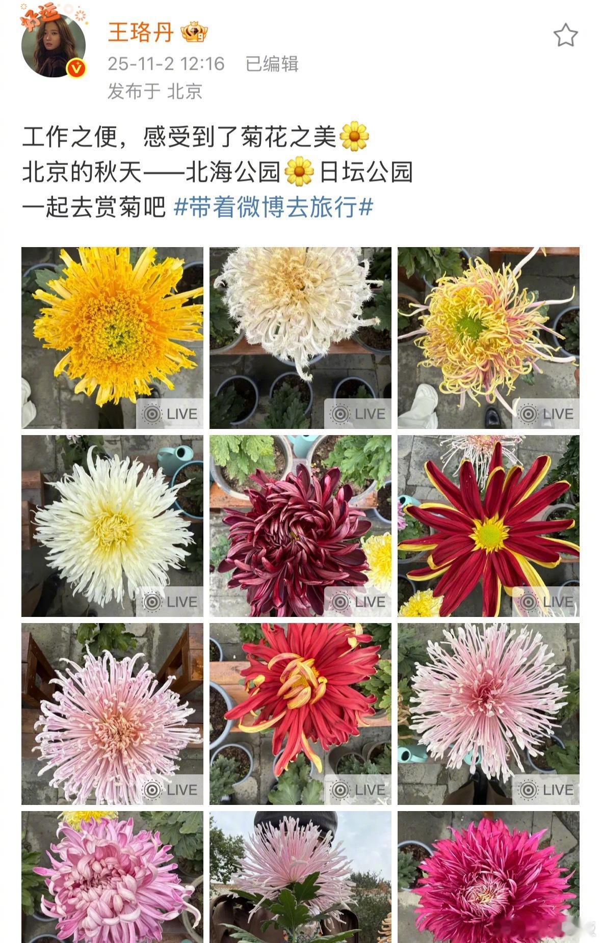 王珞丹分享巨型菊花 来跟着一起赏菊啦~好多不同种类的菊花,赏心悦目[送花花]