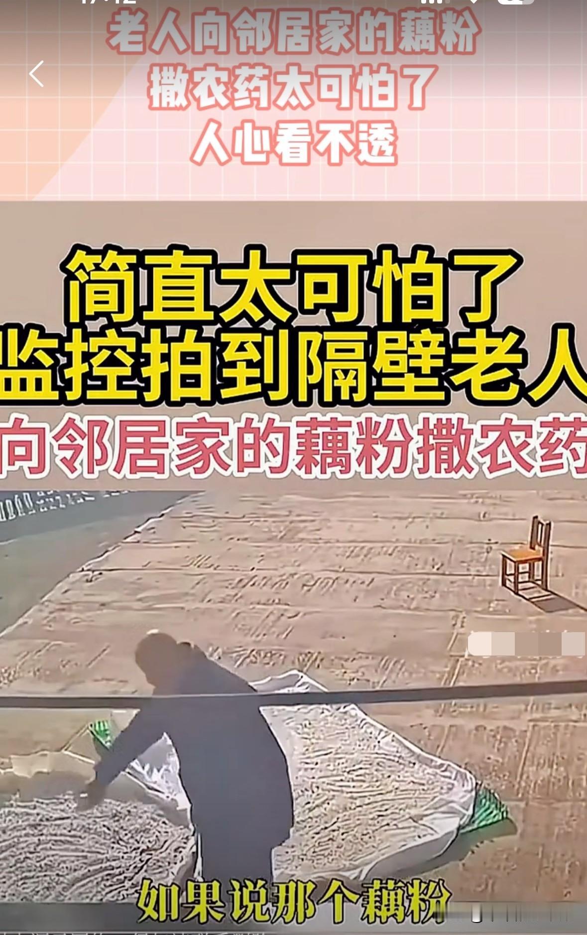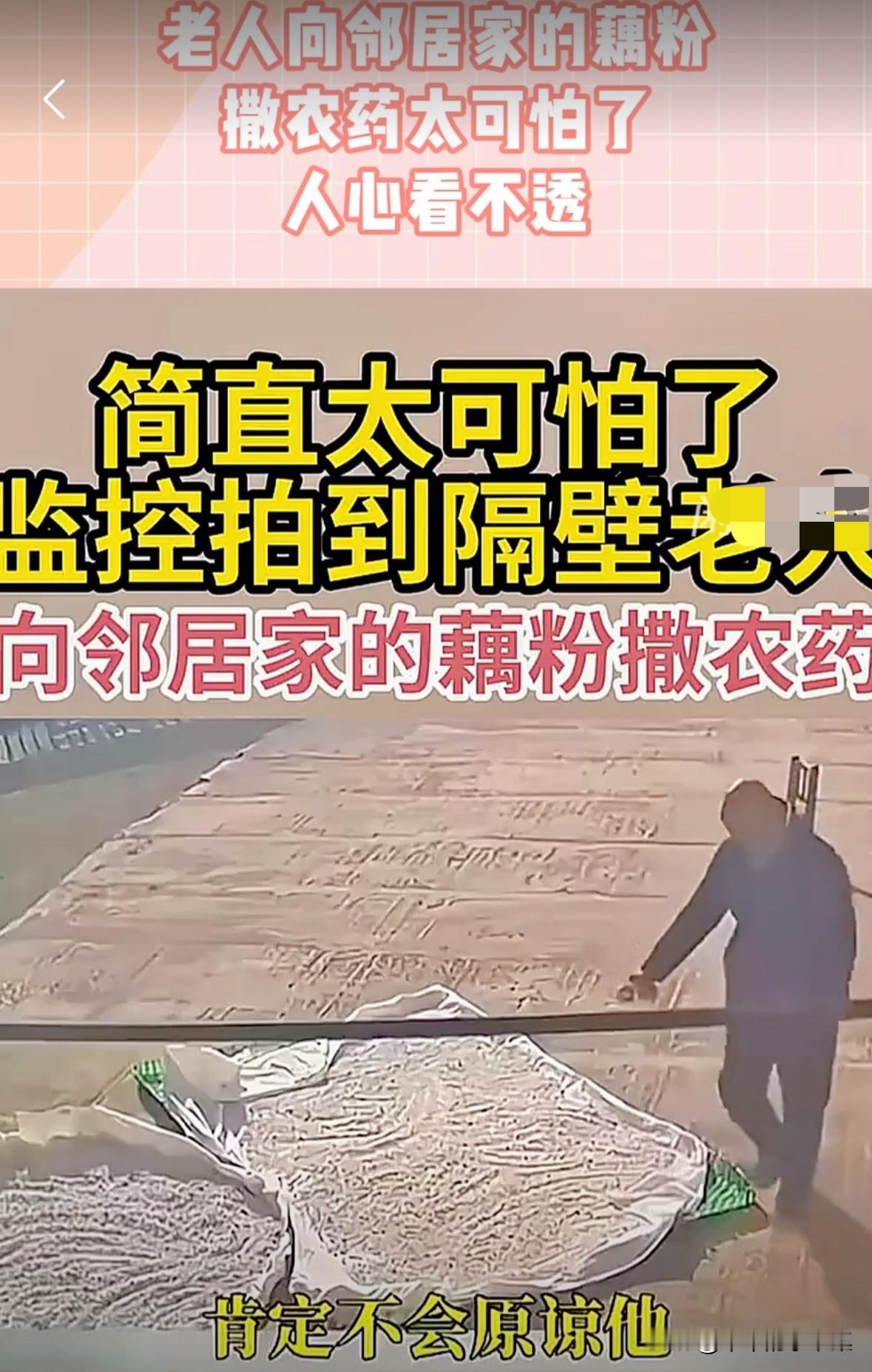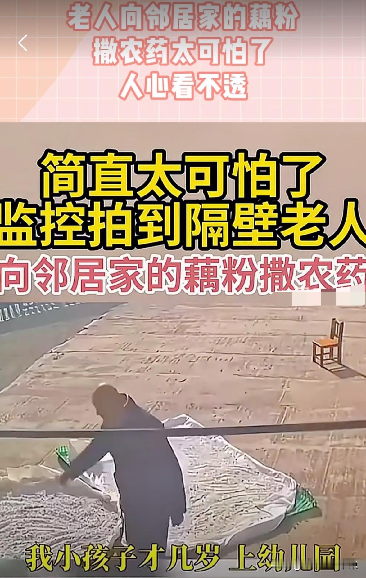 男子家院子里晒了藕粉,邻居老人过来居然在男子晒的藕粉上撒农药。 幸亏男子家院子里有监控,正好拍到,老人手里确实拿的是农药。 男子说:“我媳妇是孕妇,我女儿现在在上幼儿园,这也太毒了!” 都知道藕粉在热水里冲一下就可以喝了,如果农药过量,后果不堪设想,这是没给人留活路啊! 就算出事了,这个老人年纪这么大了,也没人拿他怎么样!藕粉