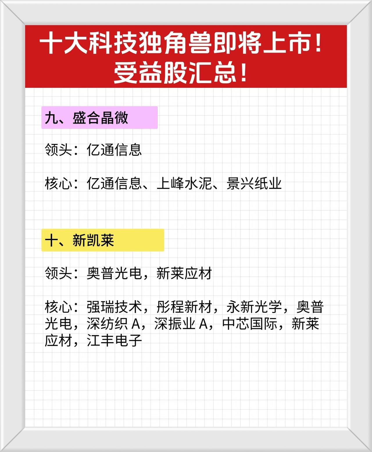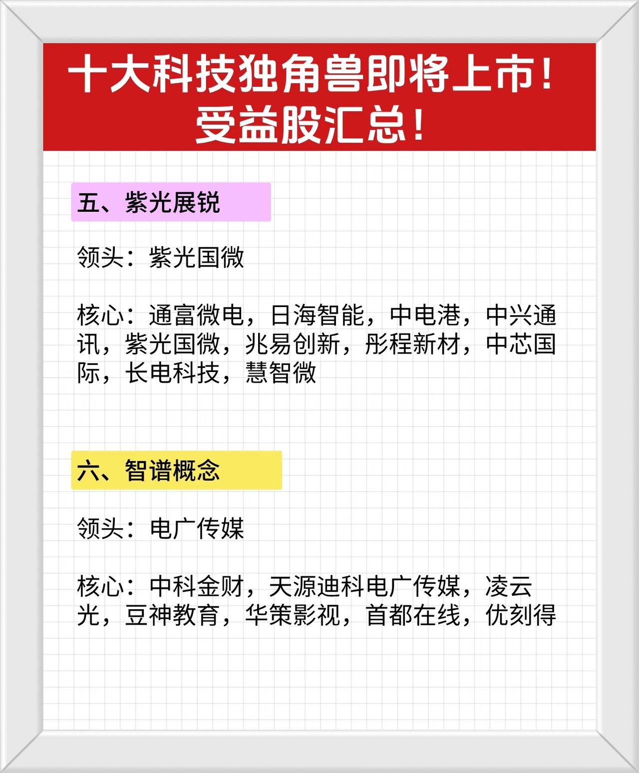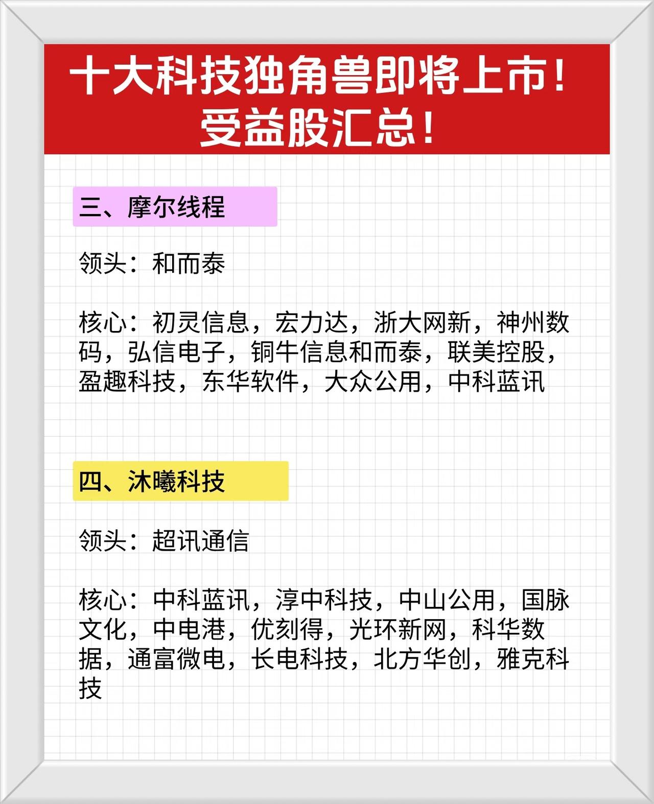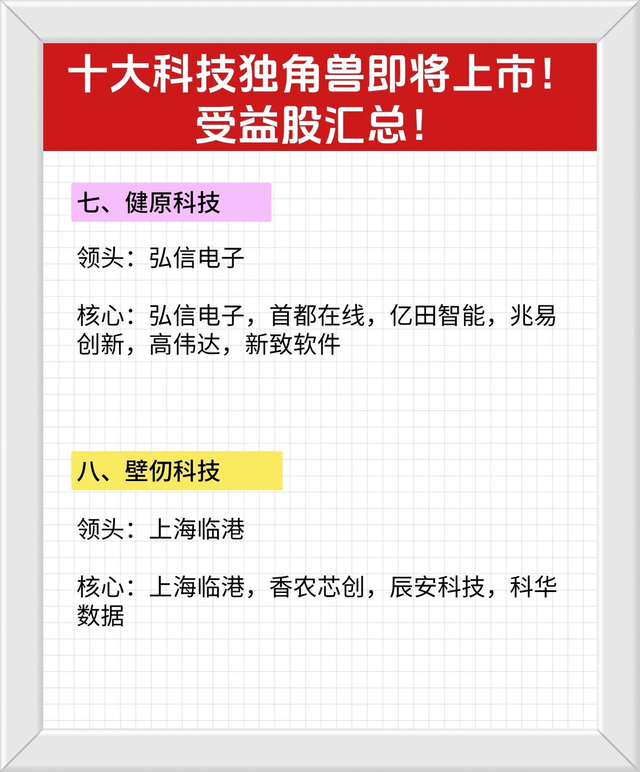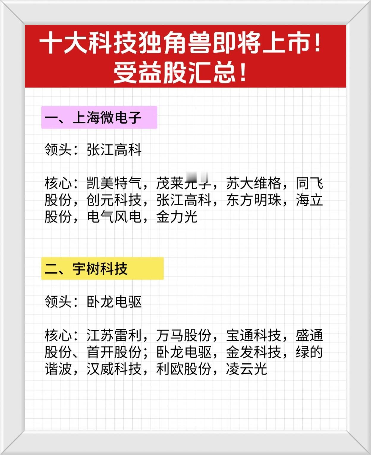 “十大科技独角兽即将上市!受益股汇总!”,详细介绍了十家具有代表性的中国科技独角兽企业及其相关的“领头”与“核心”受益股票。以下是对这十家独角兽企业及其对应受益股票的总结(未按排名顺序): 1. 上海微电子 - 领头股:张江高科 - 核心受益股:凯美特气、茂莱光学、苏大维格、同飞股份、创元科技、东方明珠、海立股份、电气风电、金力光 2. 宇树科技 - 领头股:卧龙电驱 - 核心受益股:江苏雷利、万马股份、宝通科技、盛通股份、首开股份、金发科技、绿的谐波、汉威科技、利欧股份、凌云光 3. 摩尔线程 - 领头股:和而泰 - 核心受益股:初灵信息、宏力达、浙大网新、神州数码、弘信电子、铜牛信息、联美控股、盈趣科技、东华软件、大众公用、中科蓝讯 4. 沐曦科技 - 领头股:超讯通信 - 核心受益股:中科蓝讯、淳中科技、中山公用、国脉文化、中电港、优刻得、光环新网、科华数据、通富微电、长电科技、北方华创、雅克科技 5. 紫光展锐 - 领头股:紫光国微 - 核心受益股:通富微电、日海智能、中电港、中兴通讯、紫光国微、兆易创新、彤程新材、中芯国际、长电科技、慧智微 6. 智谱概念 - 领头股:电广传媒 - 核心受益股:中科金财、天源迪科、电广传媒、凌云光、豆神教育、华策影视、首都在线、优刻得 7. 健原科技 - 领头股:弘信电子 - 核心受益股:弘信电子、首都在线、亿田智能、兆易创新、高伟达、新致软件 8. 壁仞科技 - 领头股:上海临港 - 核心受益股:上海临港、香农芯创、辰安科技、科华数据 9. 盛合晶微 - 领头股:亿通信息 - 核心受益股:亿通信息、上峰水泥、景兴纸业 10. 新凯莱 - 领头股:奥普光电、新莱应材 - 核心受益股:强瑞技术、彤程新材、永新光学、奥普光电、深纺织A、深振业A、中芯国际、新莱应材、江丰电子