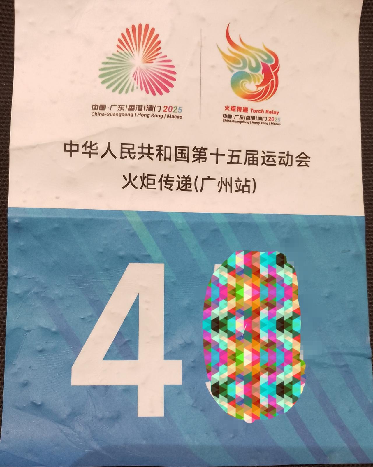 今天早上广州的第十五届全国运动会火炬传递结束后,我来到海心沙火炬传递路段的时候,发现这张40几号的贴纸,我女儿查了一下,每个号码都可以查到是谁,这个号码的人是一个企业老总,于是我就觉得不能随便丢掉了,可能他本人并不觉得有什么,而我就当一件见证广州全运会的收藏品,我还买了一些全运会的其他产品放在家里收藏起来了。