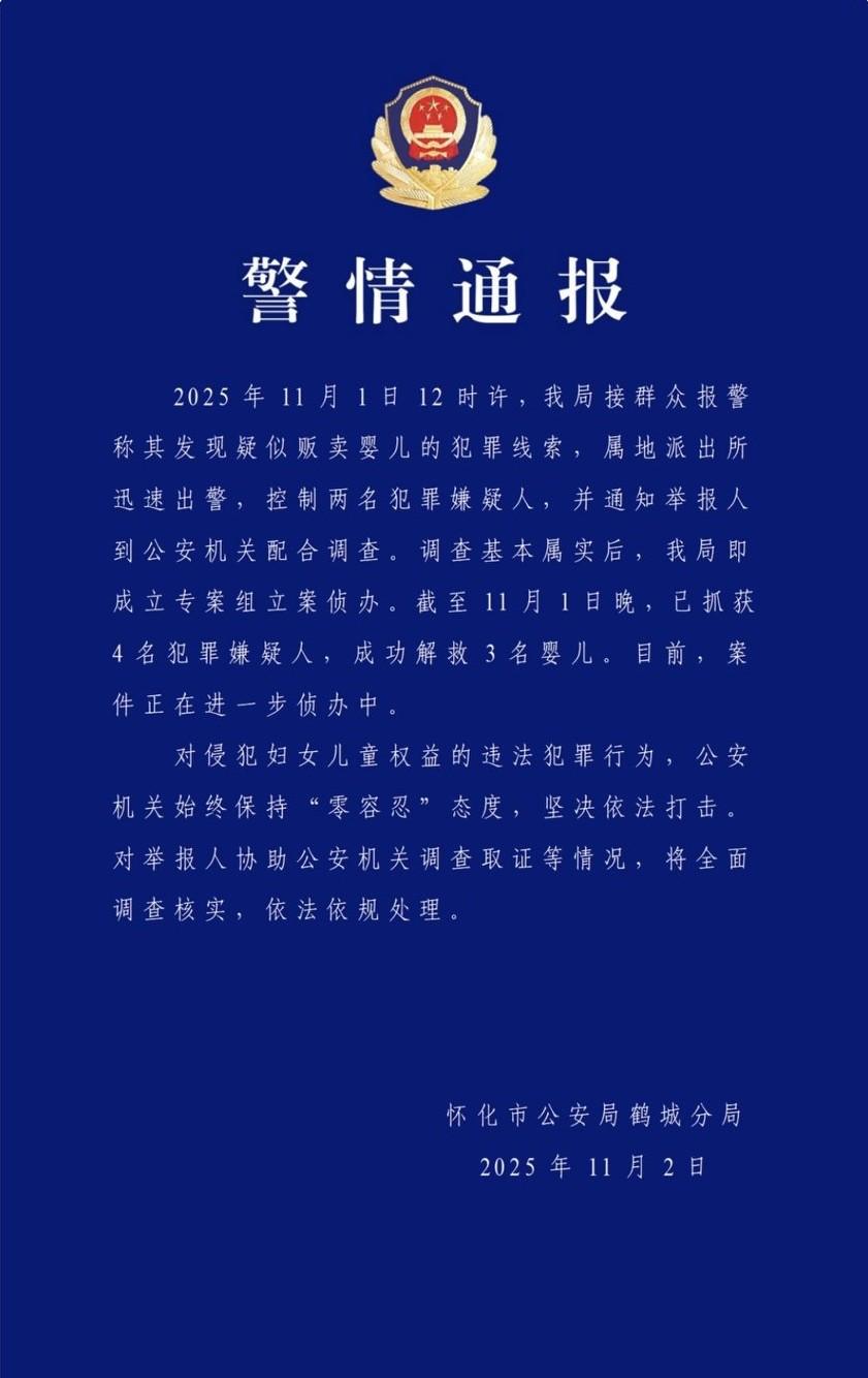 11月2日,湖南怀化警方通报了一起解救婴儿的案件。11月1日12时许,警方接到群众报警,属地派出所迅速出警控制两名犯罪嫌疑人,还让举报人到公安机关配合调查。随后成立专案组立案侦办,到当晚就抓获了4名犯罪嫌疑人,成功解救出3名婴儿。 A网友:不可思议,居然还有贩卖婴儿的,不严惩,这样的犯罪会永无止境的! B网友:有买才有卖,只有买家、卖家同罪才能解决源头问题。 C网友:建议以后抓到人贩子,先让丢了孩子的家长和人贩子待在一起,然后再走法律流程。 人贩子太可恶,为了利益将罪恶之手伸向无辜婴儿,让多少家庭支离破碎。好在警方行动迅速,及时斩断了这罪恶的链条。必须给警方点赞,也希望案件能尽快侦破,严惩这些人贩子!