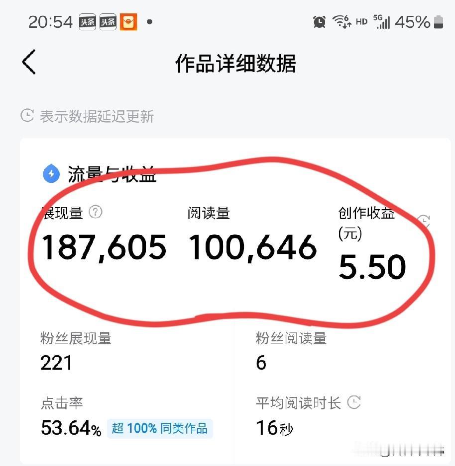 昨天的收益出来了,看了数据,我差点没哭了。 这结果让我看了,有点儿欲哭无泪的感觉,头条也给的太少了吧,好不容易爆一条呀。 从明天开始,继续努力争取每天都出一个爆款微头条。慢慢的积少成多嘛,要知足,不知足,永远都不快乐。