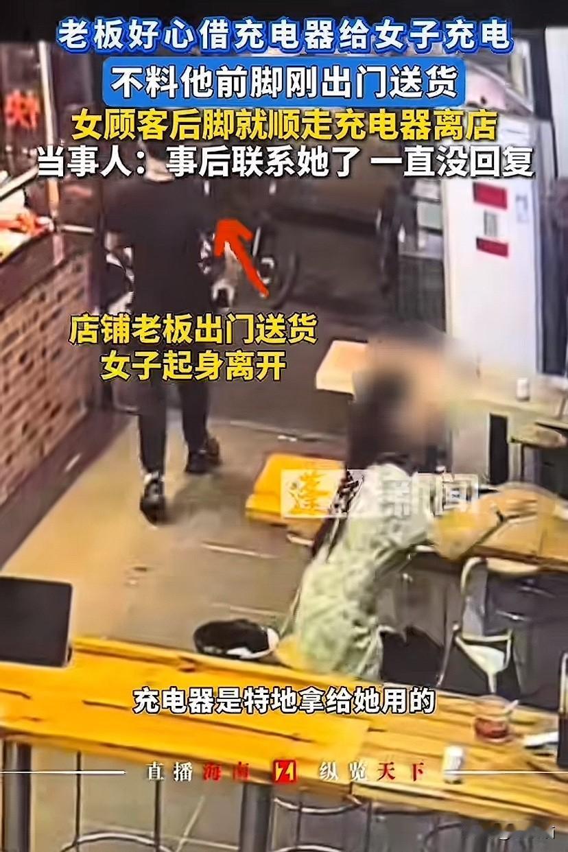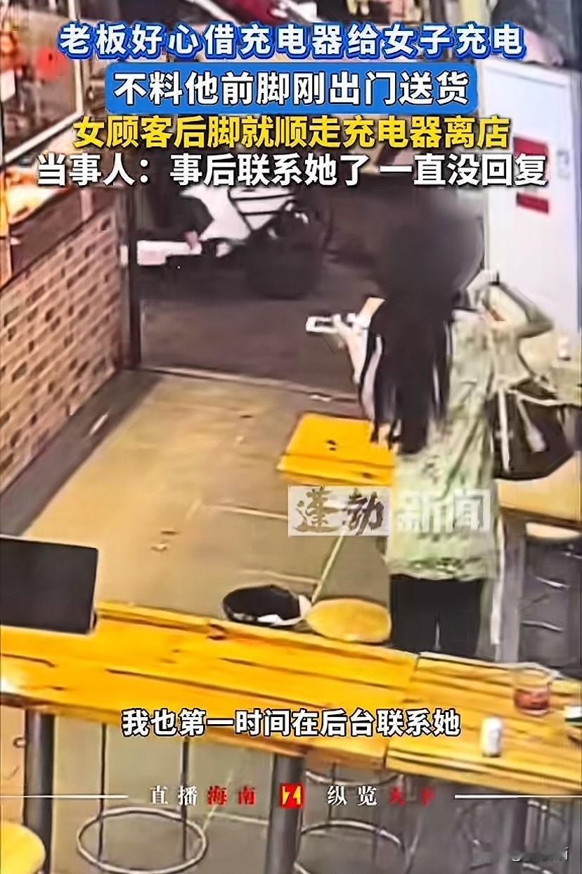 广东广州,老板好心借充电器给顾客充电,不料他前脚出门送货,该顾客后脚就把充电器带走。老板称事后联系该顾客一直不回复,隔天却跑到自己另外一家店吃饭。 许先生的餐饮店来了一位女顾客,女顾客点餐后找到许先生称自己的手机快没电了,问店里有没有充电器,借来充一下电。 许先生听后没有多想就把店里唯一的一个充电器拿给该顾客使用。 后来许先生有事要出门送货。在许先生前脚刚出门,女顾客也从座位上站起来结账离开,还顺手把充电器给带走。 送货回来的许先生寻找充电器未果,查看监控才知道被女顾客拿走。许先生便在后台联系女顾客,想让她把充电器还回来。谁知道女顾客一直不回复许先生。 隔天,许先生得知该女顾客到自己的另外一个店消费了。却全程没有说充电器的事,也依然没有回复许先生的消息。