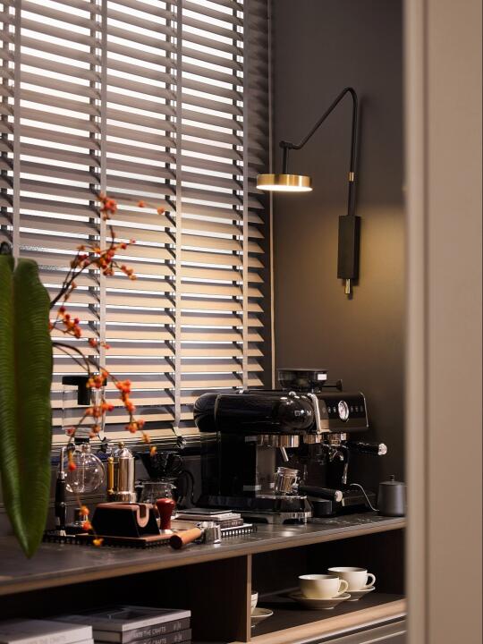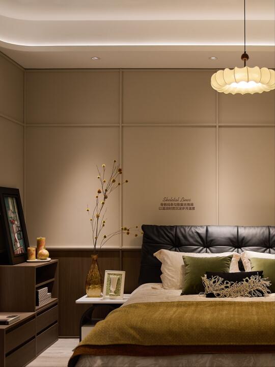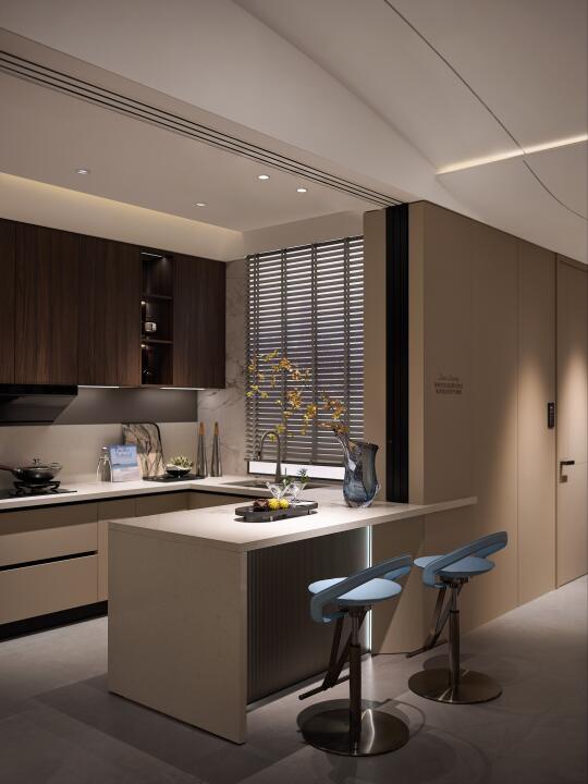 设计语言非常克制:木色、灰白、轻微亮色点缀,大面积留白让空间拥有自然的呼吸节奏。柜体、岛台、书桌、阳台并不刻意“出镜”,却悄然嵌入了系统逻辑与收纳细节。